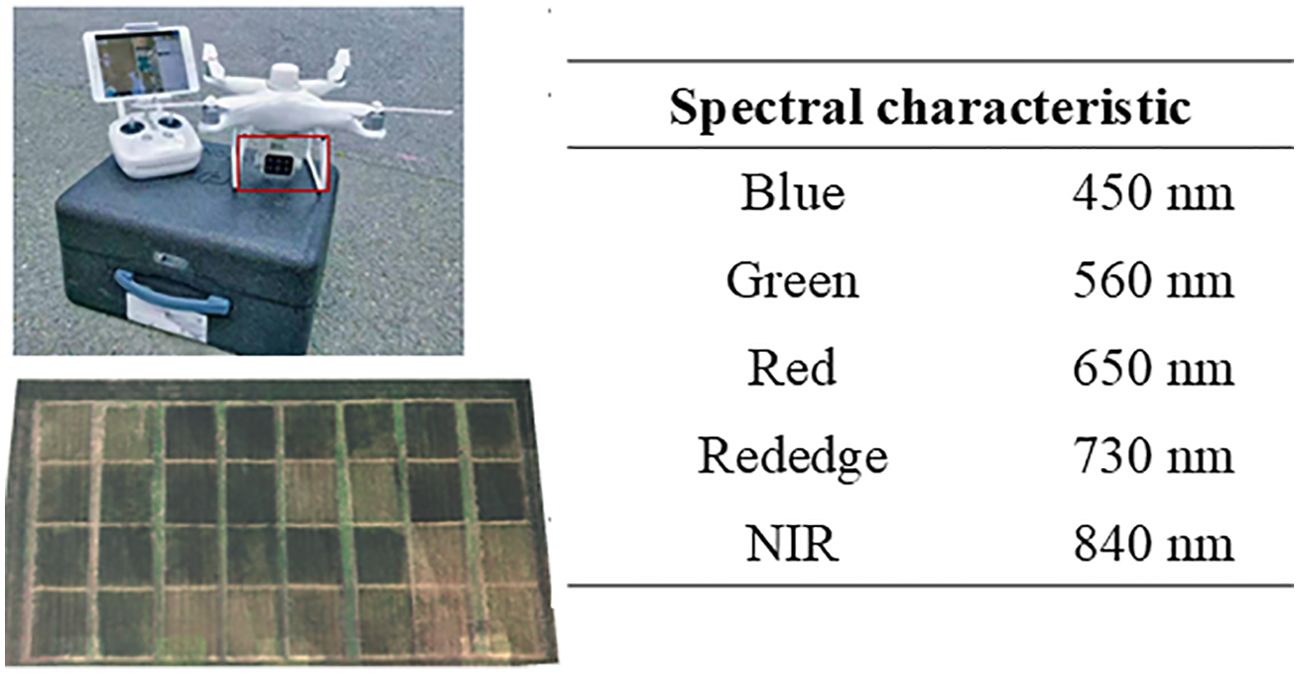 A quadcopter UAV (Phantom 4 Pro, DJI, China) was used to collect remote sensing data under favorable weather conditions, specifically clear skies, no wind, and no cloud cover, with all flights adhering to the same take-off points and flight paths to ensure uniformity. Missions were conducted at 12:00 PM, maintaining a flight altitude of 30 m, with 80% forward and 85% lateral overlap. Prior to image acquisition, reflectance data from a spectral calibration panel were recorded to correct the pixel brightness values in the multispectral images. Orthomosaics were generated using Pix4Dmapper 4.3. Additional details on the image processing workflow can be found in Yang et al. (2021). The spectral characteristics of the sensor are illustrated in Figure 2b.