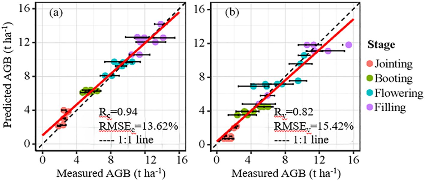 where AGBr, AGBs and m represent aboveground biomass predicted from remote sensing data, aboveground biomass simulated by the DSSAT model, and the number of monitored growth stages, respectively.