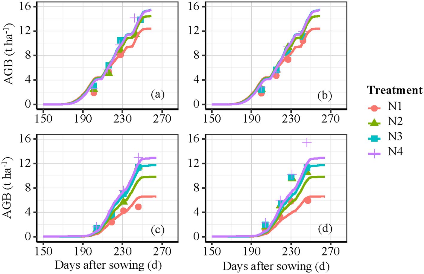 The amount of simulated AGB under different N fertilizer treatments based on the DSSAT model increased with the advancement of growth stages. AGB accumulation increased with increasing N fertilizer rates (Figure 5), while the difference between N3 and N4 treatments was relatively small. This suggests that excessive fertilization has a limited effect on crop yield improvement. Therefore, N fertilizer recommendations should balance both economic and ecological benefits. The amount of simulated AGB at various growth periods closely corresponded to the measured AGB, with nRMSE values of 11.20% and 19.44% for the calibration and validation datasets, respectively (Figure 6a). Similarly, the yield results simulated by the DSSAT model showed good agreement with the observed data, with nRMSE values of 6.35% and 11.12% for the calibration and validation datasets, respectively (Figure 6b).