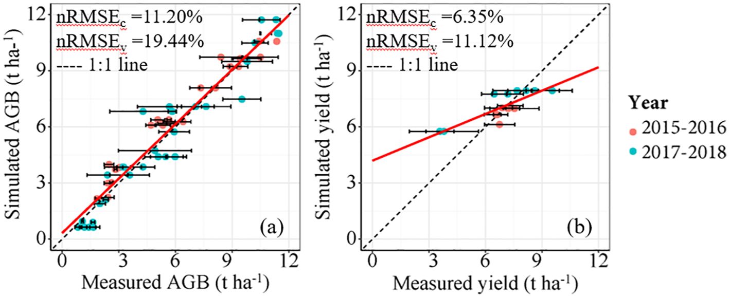 Figure 6. Relationships between measured and simulated AGB (a) and measured and simulated yield (b) for winter wheat based on DSSAT Model. Note: The horizontal lines in the FIGURE represent the standard error.