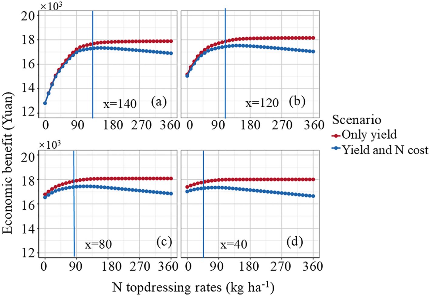 This study explores how crop income responds to different N topdressing rates under fixed basal N levels (N1–N4), with total N topdressing rates ranging from 0 to 360 kg ha-¹ (Figure 7). When fertilizer costs are not considered, total income increases with the amount of fertilizer applied, indicating that higher N application can boost crop yield and, consequently, total income. Specifically, the total income reached its maximum at a fertilization rate of 360 kg ha−¹ under N1, N2, N3 and N4 treatment levels. However, maximizing income without considering fertilizer costs does not reflect the actual profit for farmers. Specifically, the optimal fertilization rates for N1, N2, N3 and N4 treatments are 140 kg ha−1, 120 kg ha−1, 80 kg ha−1 and 40 kg ha−1, respectively (Figure 7). In practical agricultural production, farmers should find a balance between fertilizer application and its cost to optimize net income. Therefore, the study highlights that while increasing fertilizer application can enhance crop income, excessive fertilization may lead to high costs that reduce net income, making it crucial for farmers to use an appropriate amount of fertilizer to maximize profitability.