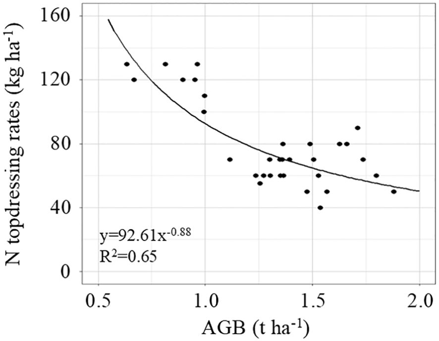 Figure 8. Relationship between AGB and N fertilization topdressing rates based on the data assimilation system.
