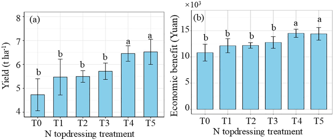 Figure 10. Effects of fertilization treatments on yield (a) and economic benefit (Yuan) under different yield levels (b).