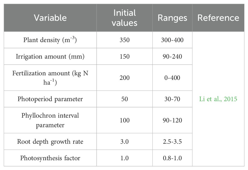 In PSO, a swarm of particles explores a D-dimensional parameter space, with each particle representing a potential solution. Particle positions and velocities are updated based on both individual and collective experience to gradually approach the global optimum (Yi and Ge, 2005; Elbeltagi et al., 2005). In this study, AGB during key growth stages was defined as the state variable for data assimilation. Each particle represents a set of DSSAT model parameters, including four genotype traits (P1D, PHINT, RDGS, SLPF) and three management practices (planting density, irrigation, and fertilization). According to preliminary experiments conducted at the same experimental site and the results of previous modeling studies, the initial velocity in each dimension was set to approximately 10% of the dynamic range of the corresponding variable (Table 1, Li et al., 2015).