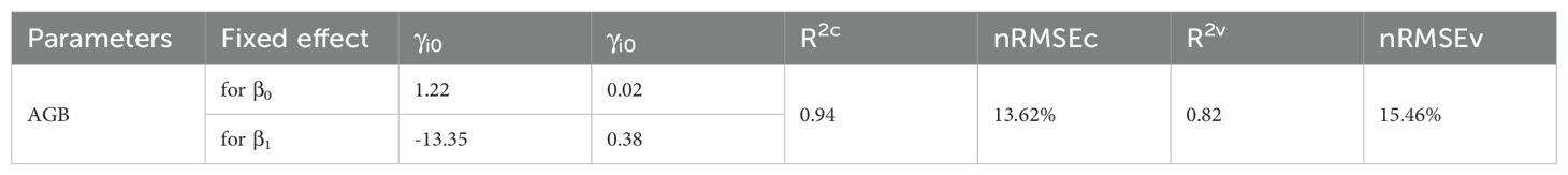 Remote sensing monitoring of AGB reflects dry matter accumulation and is closely related to yield; accurate monitoring is a key basis for achieving precise N fertilization. To address the challenge of applying AGB remote sensing models across the entire growth period, this study employs a hierarchical linear model based on accumulated temperature and vegetation indices, which shows significant advantages in monitoring winter wheat AGB at multiple growth stages (Li et al., 2022; Yue et al., 2023; Zhao et al., 2025). In this study, the calculation formula for the AGB monitoring model based on UAV multispectral imagery as Equation 3: