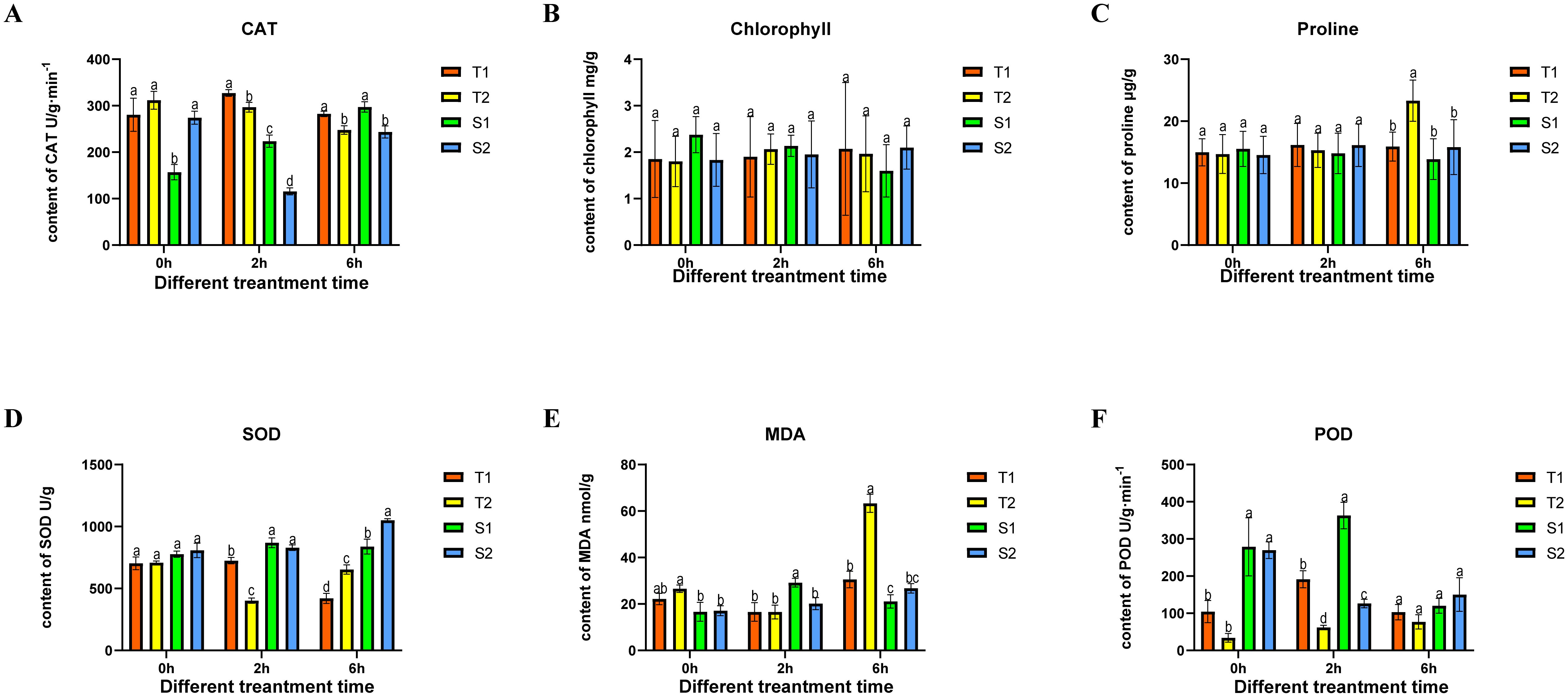 Figure 3. The changes in four type Glycyrrhiza inflata key physiological indicators after being subjected to different time periods of coercion CAT (catalase), SOD (Superoxide Dismutase), MDA (Malondialdehyde), POD (Peroxidase). The differences between samples were determined by one-way analysis of variance (ANOVA), and the significance difference when P < 0.05 was calculated by the least significant difference (LSD) test. All data represent root tissue samples only.
