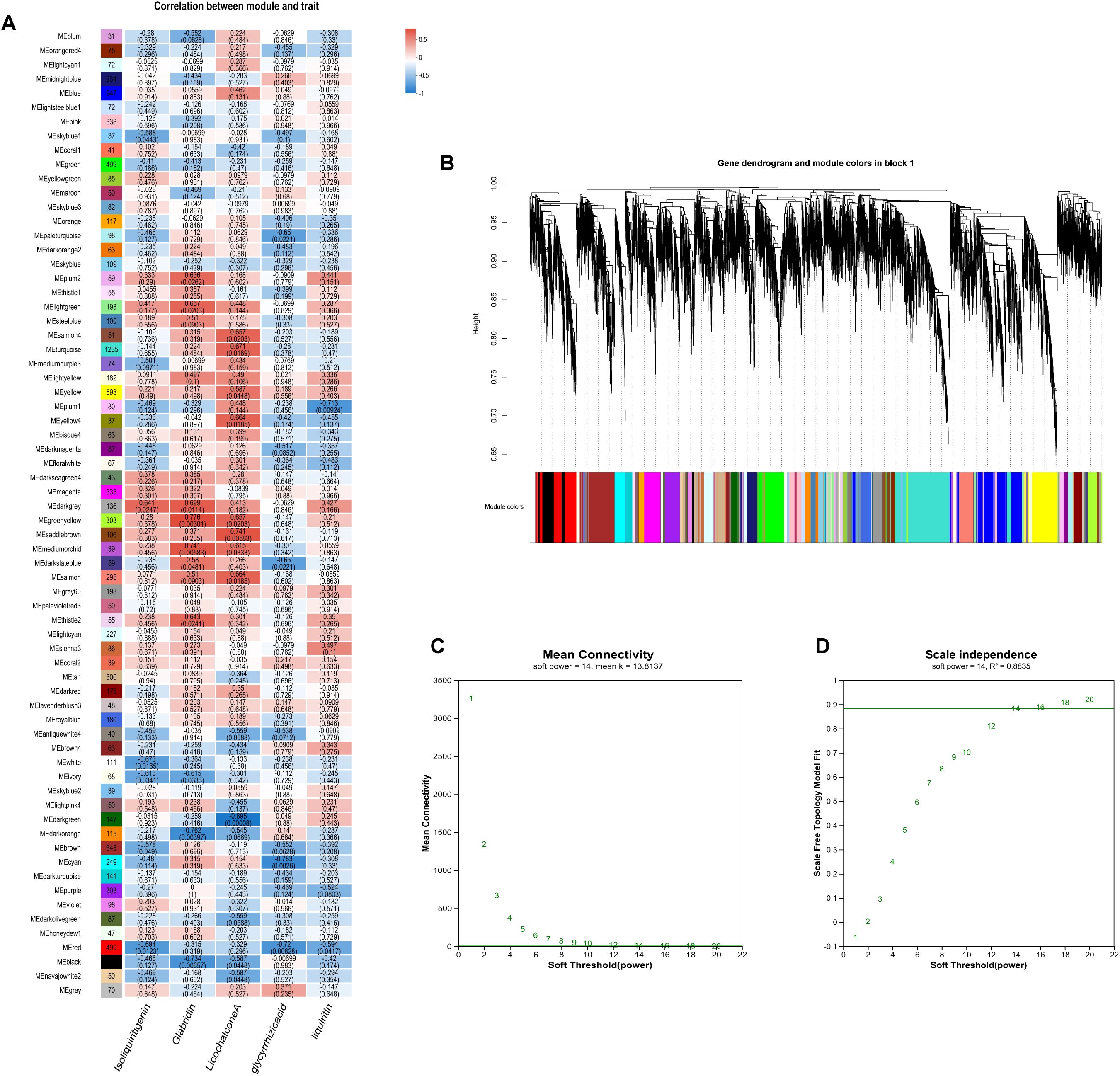 Figure 8. Results of the gene co-expression network analysis. (A) The heatmap of correlation coefficient between flavonoids contents and module eigengenes with the red and blue blocks representing positive and negative correlations, respectively; (B) Dendrogram showing modules identified by the weighted gene coexpression network analysis (WGCNA) and clustering dendrogram of expressed genes; (C) Average connectivity curve; (D) Scale-free wide comfort curve.