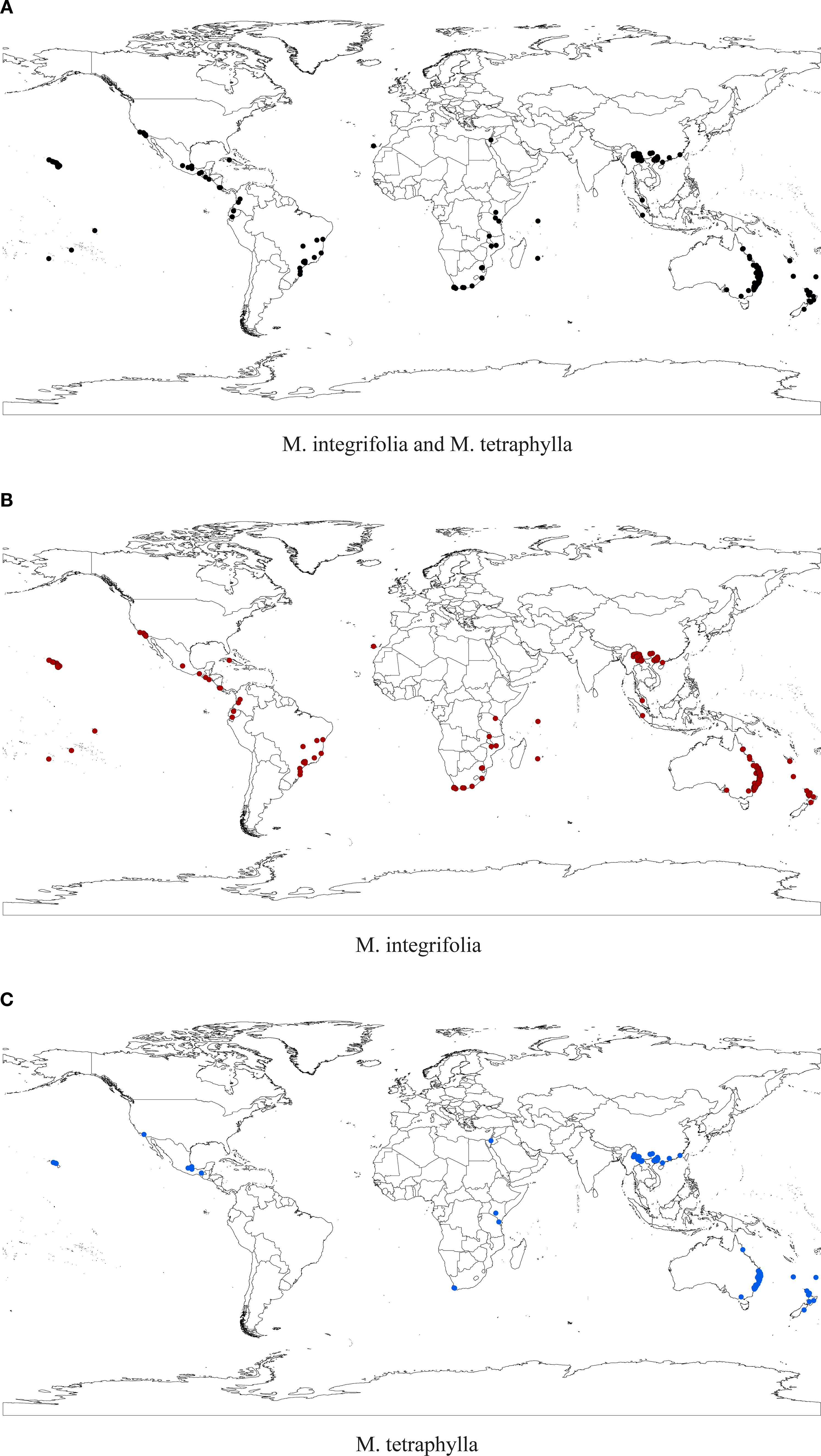 Map series showing global distributions of Macadamia. Panel a: Combined distribution of M. integrifolia and M. tetraphylla, marked with black dots. Panel b: Distribution of M. integrifolia, marked with red dots, mainly in Australia and parts of Central and South America. Panel c: Distribution of M. tetraphylla, marked with blue dots, primarily in Australia, Africa, and parts of Central America.