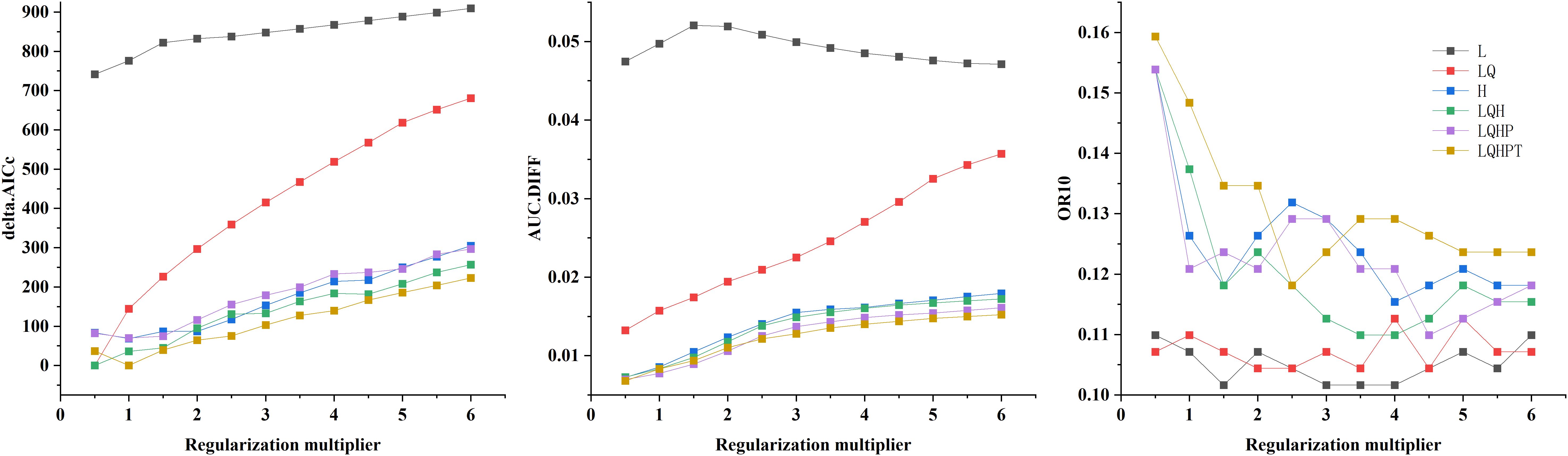 Three line graphs display the effects of regularization multipliers on different metrics with colored lines representing various data series. The first graph shows “delta.AICc” against regularization multipliers, with readings increasing across intervals. The second graph shows “AUC.DIFF,” where values initially increase and then stabilize. The third graph shows “OR10,” depicting varied changes, with values peaking or dipping at different points. A legend identifies the series as L, LQ, H, LQH, LQHP, and LQHPT.