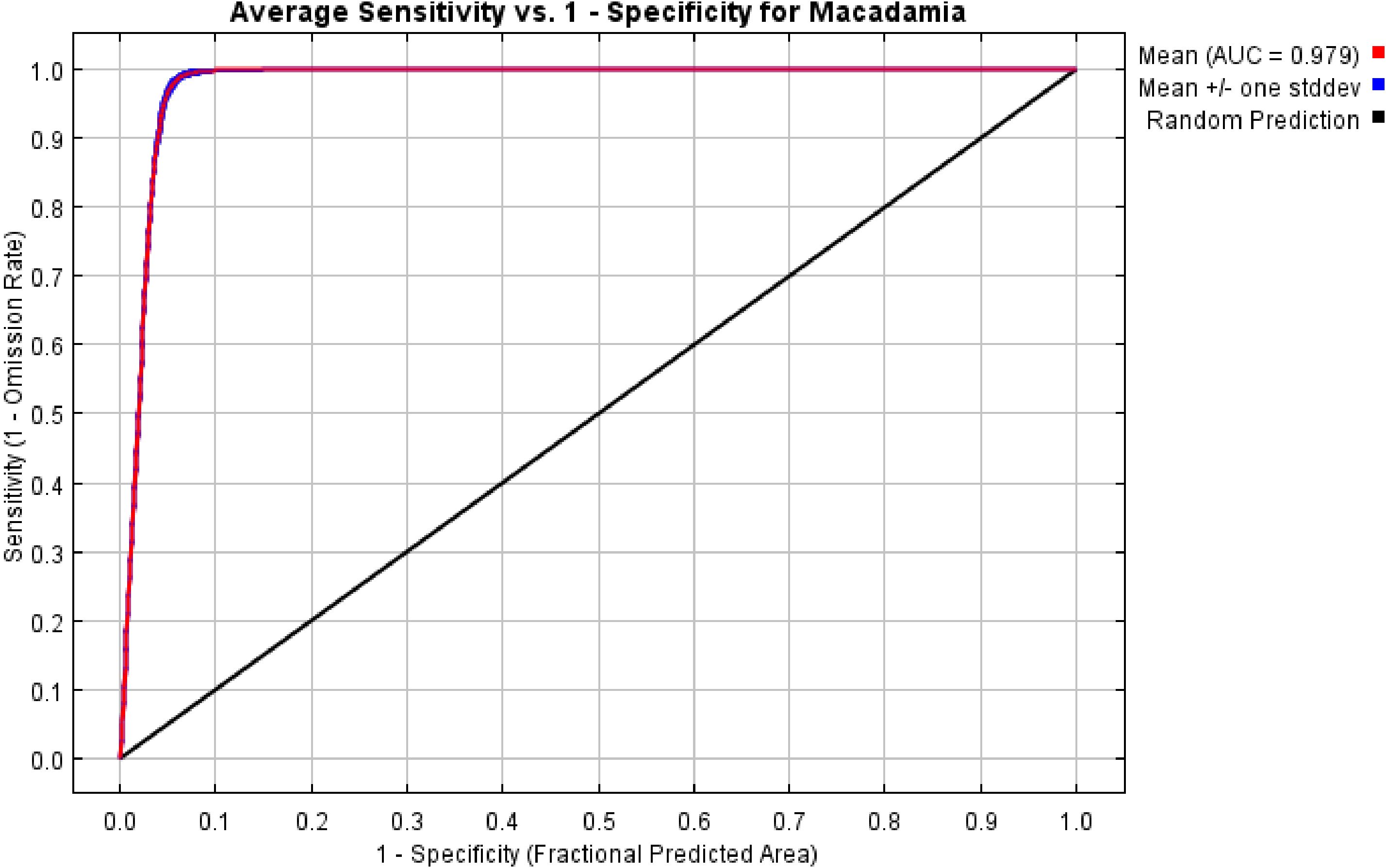 ROC curve showing average sensitivity vs. 1-specificity for macadamia with a mean area under the curve (AUC) of 0.979. The mean line is red, and a one standard deviation range is indicated in blue. A random prediction line is marked in black. Sensitivity is plotted on the Y-axis and 1-specificity on the X-axis.