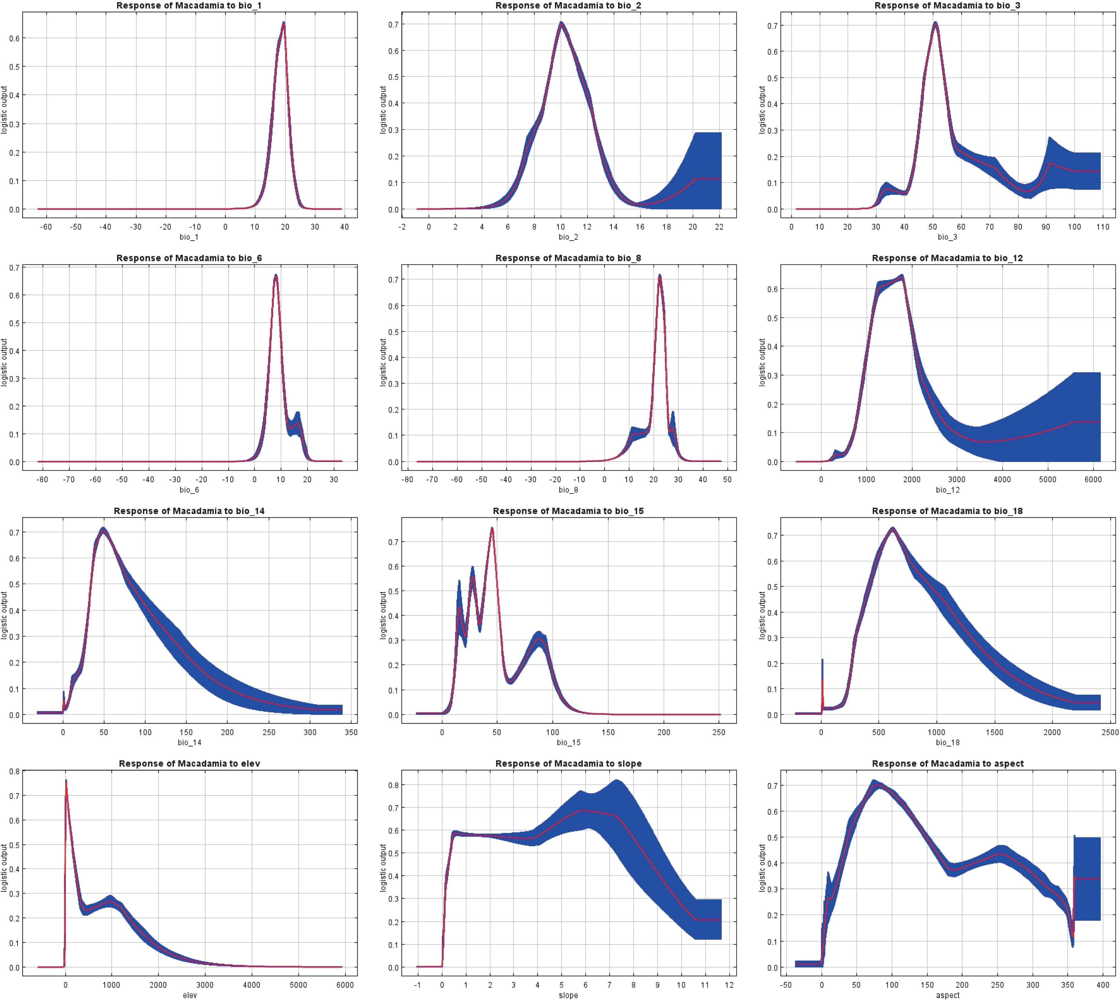 Graphical representation of macadamia's response to various bioclimatic factors and topographical variables. Each chart illustrates the response with a blue shaded uncertainty area surrounding a red line, depicting the relationship to variables such as temperature, precipitation, elevation, slope, and aspect. There are twelve distinct plots, each labeled with different bioclimatic and environmental variables like bio_1 to bio_18, elevation, slope, and aspect, indicating their influence on macadamia suitability.
