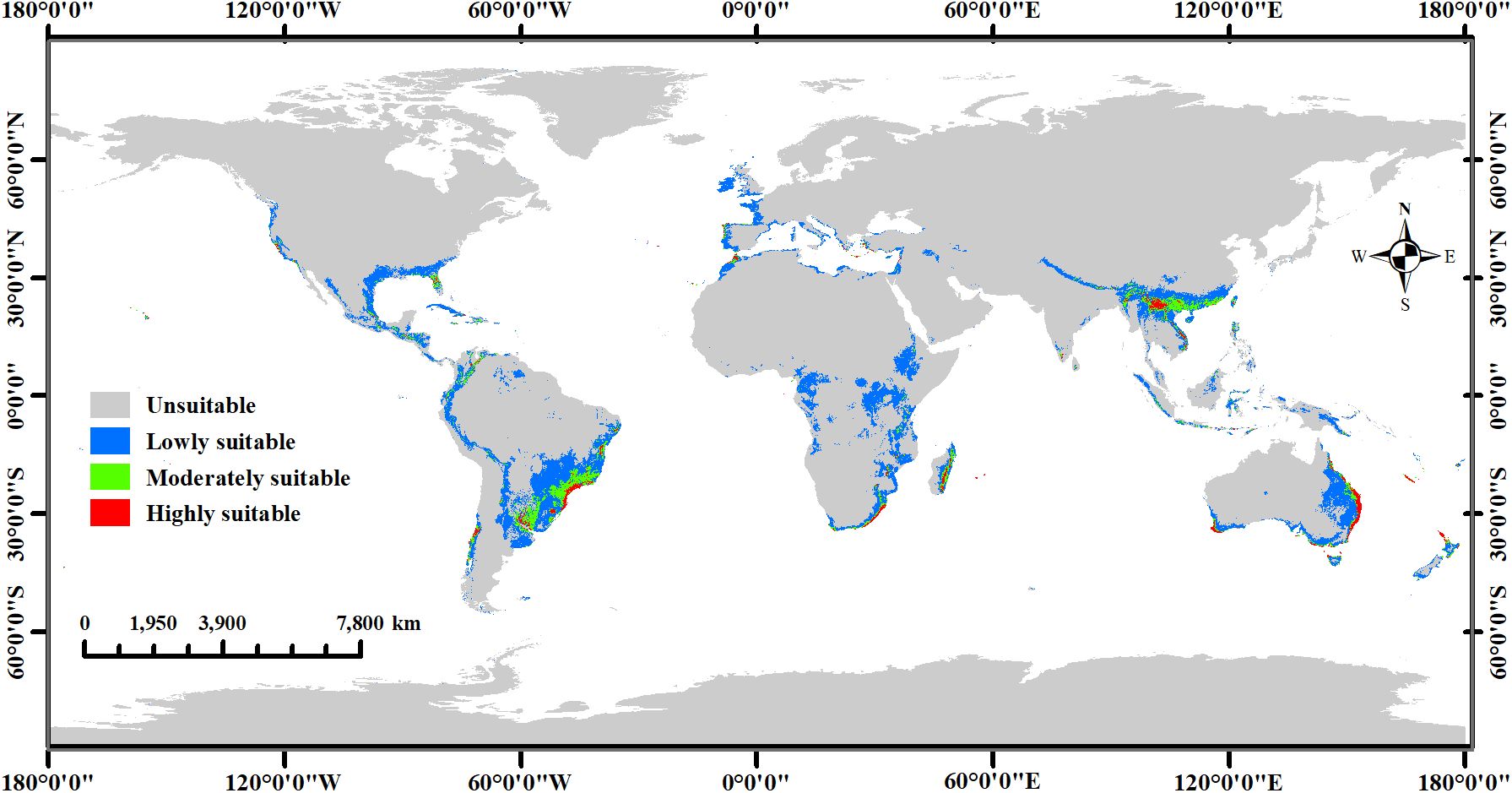 3.3 Global distribution of Macadamia suitable habitats under the current climate scenario