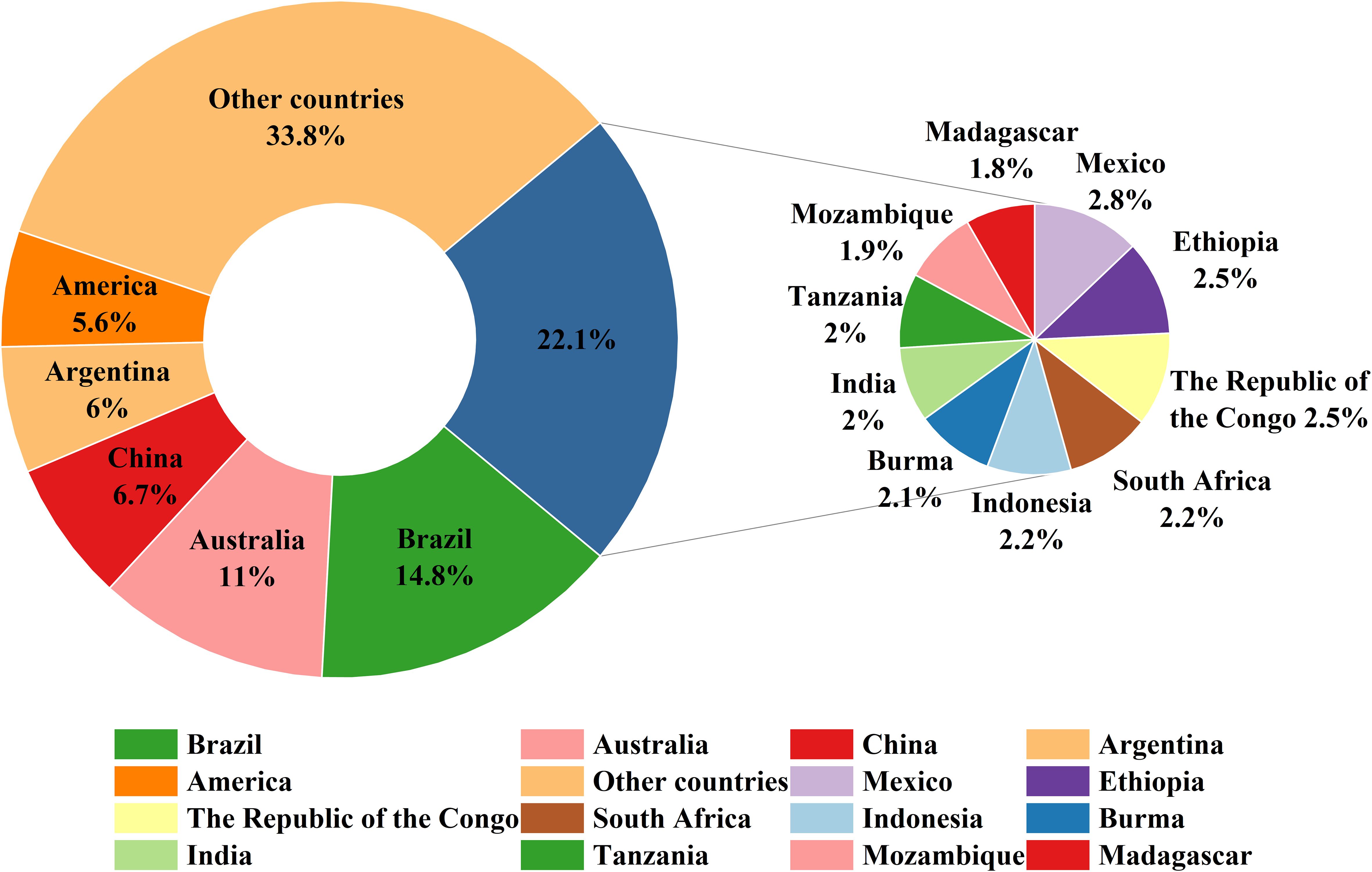 A donut chart shows the contribution percentages of various countries, with Brazil at 14.8%, Australia at 11%, China at 6.7%, Argentina at 6%, America at 5.6%, and other countries at 33.8%. A smaller pie chart details the “Other countries” segment, showing individual percentages like Madagascar at 1.8%, Ethiopia at 2.5%, and Mexico at 2.8%. A legend identifies each country's color.