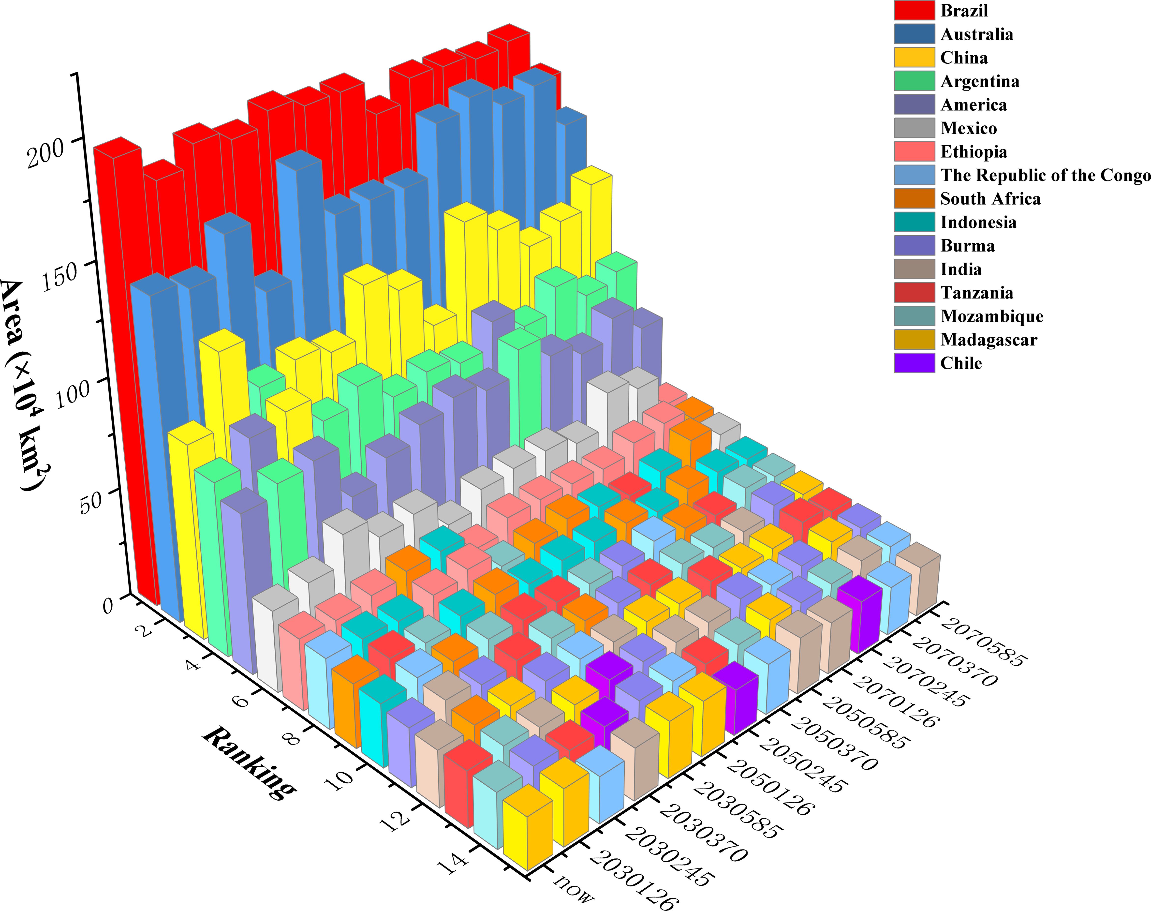 Three-dimensional bar chart displaying the area rankings of various countries over specific years. Each country is represented by a different color, as indicated by the legend on the right. The x-axis represents rankings, the y-axis denotes the area, and the z-axis indicates time, spanning from 2030 to 2070. Countries like Brazil, China, and America show higher rankings with taller bars.