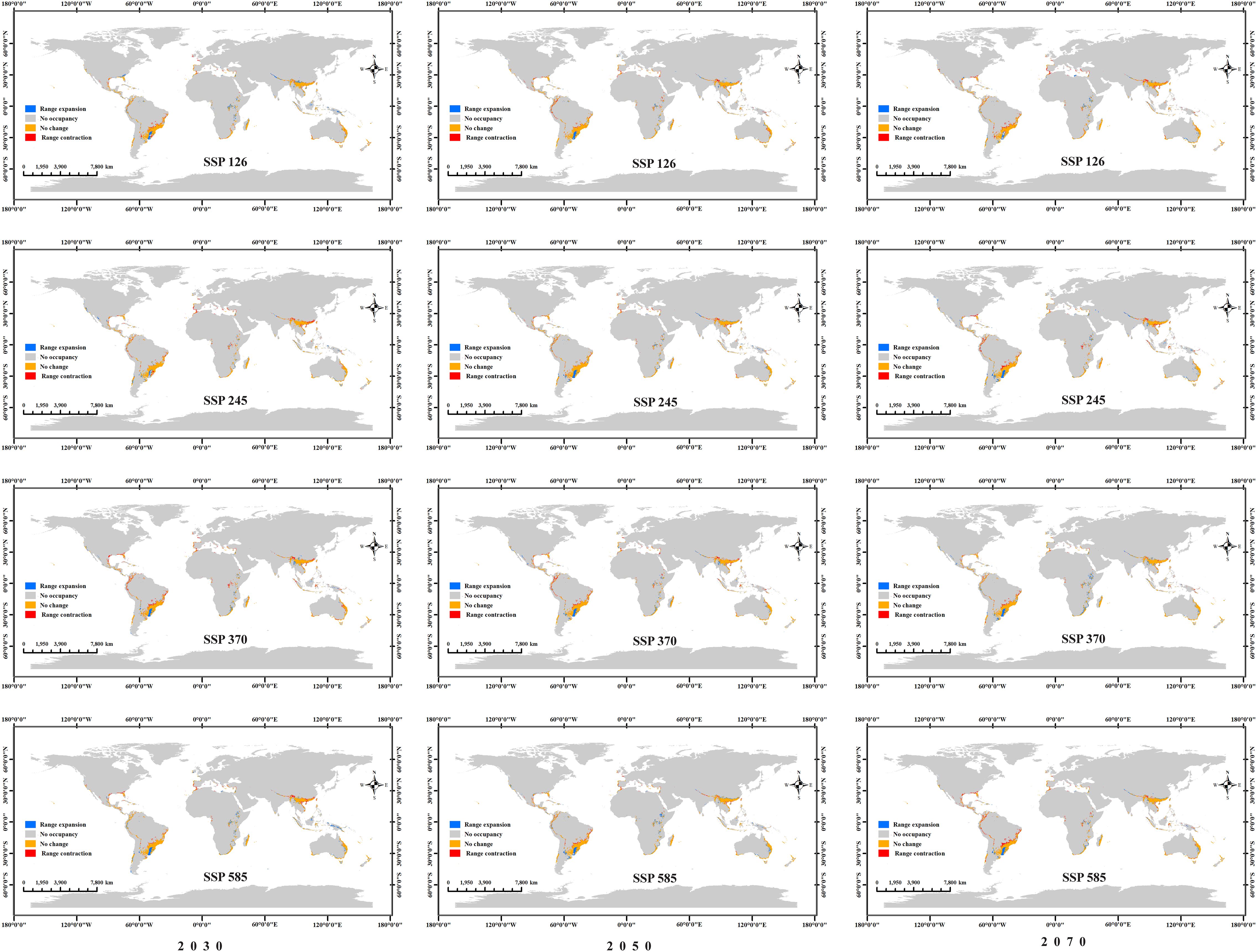 The present study considered four climate scenarios (SSP126, SSP245, SSP370, and SSP585) across three future periods (2030s, 2050s, and 2070s) to predict the global distribution of suitable habitats for Macadamia (Supplementary Figure S2). The distribution of suitable habitats for Macadamia was significantly altered under the various climate scenarios across the different future periods (Table 1).