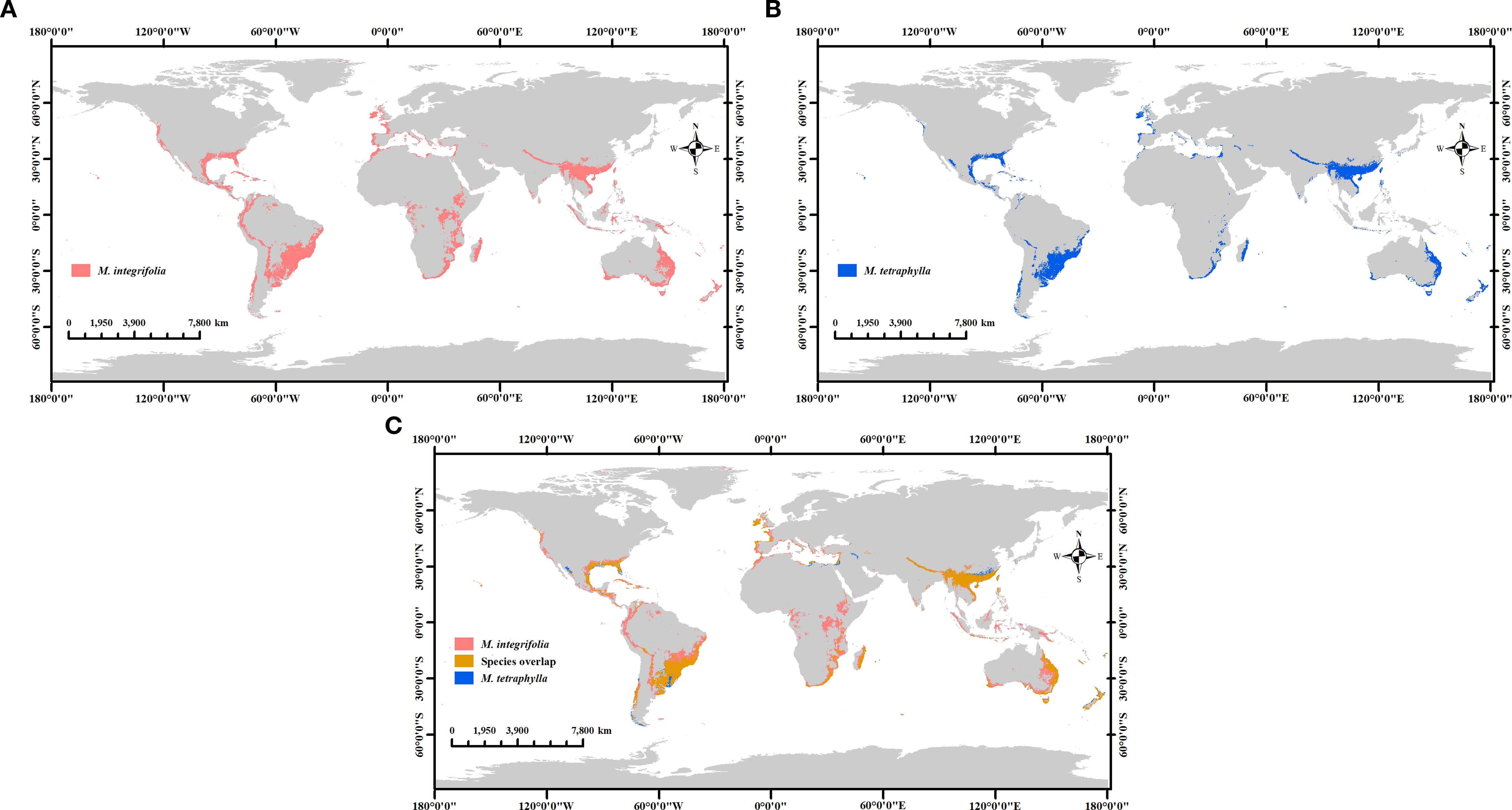 The model parameters were set to operate in accordance with current climate scenarios, and the simulations were generated and analyzed using ArcGIS 10.8 software. As shown in Figure 10, M. integrifolia was determined to exhibit a significantly larger potential habitat area (1284.78 × 104 km2) than that of M. tetraphylla (720.35 × 104 km2). Notably, compared to M. tetraphylla, the distribution of M. integrifolia extends across a substantially larger area of potentially suitable habitat, including regions in northern and central South America, central Africa, Australia, the Malay Archipelago, the United States, Mexico, and parts of western Europe.