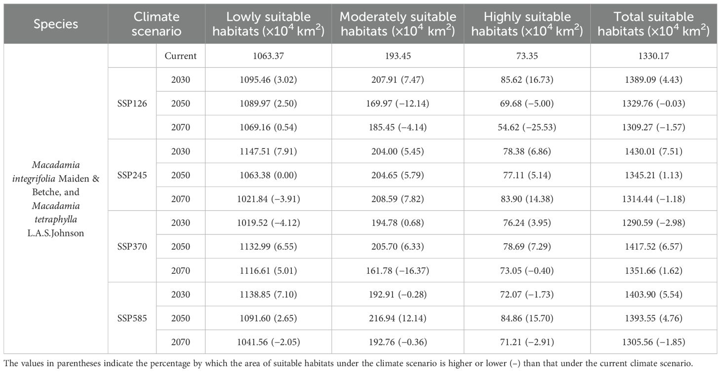 Table 1. Comparison of different Macadamia suitable habitats under four future climate scenarios (SSP126, SSP245, SSP370, and SSP585) with that under the current climate scenario.