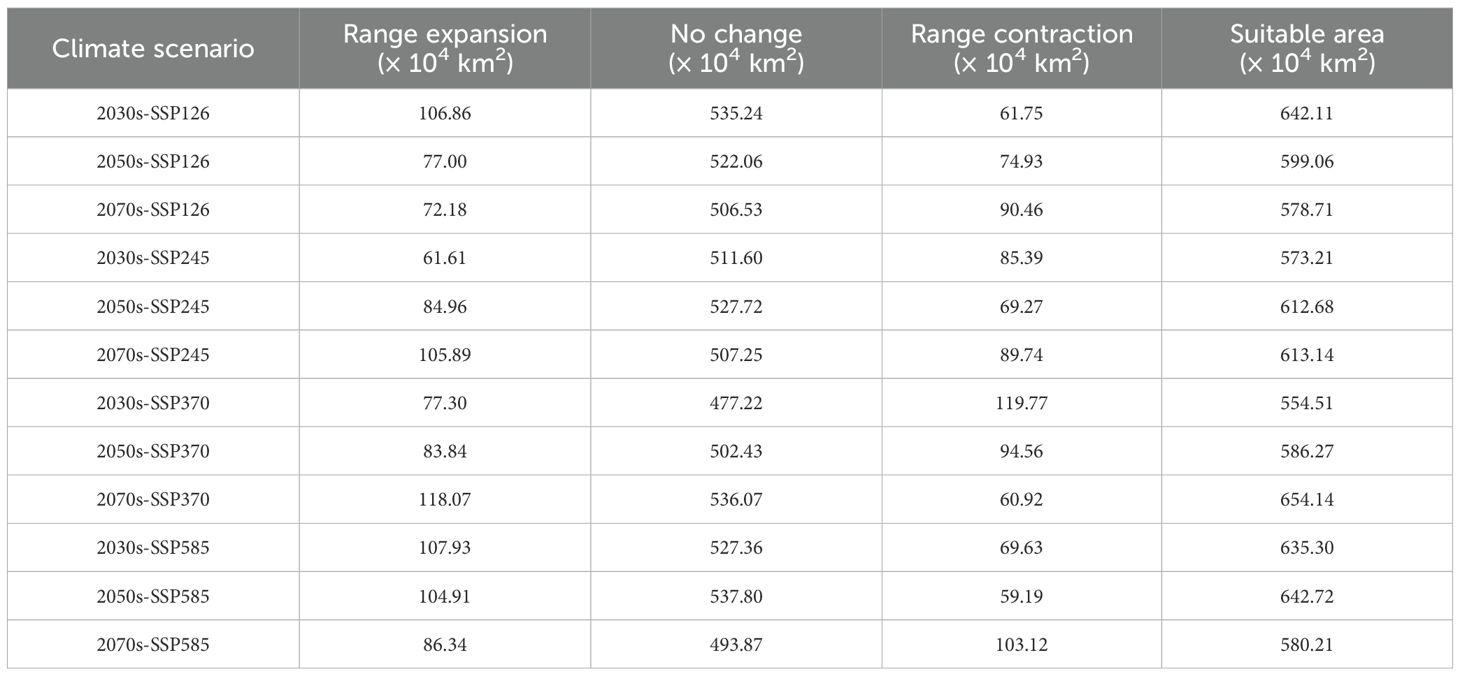 Species distributions are dramatically shaped by climatic shifts, with accumulating evidence indicating they have profoundly disrupted global biogeographic patterns (Jochum et al., 2007; Doxford and Freckleton, 2012; Matías et al., 2017; Zhao et al., 2021). The IPCC Fifth Assessment Report projects persistent global warming through 2100, predicting a temperature increase of 0.3–4.8°C relative to the 1986–2005 reference period (IPCC, 2013). Consequently, studying the potential geographic distribution of species under future climate change scenarios has become a critical research focus in numerous fields, including ecology, forestry, and agronomy (Zhao et al., 2024b; Wang et al., 2025; Zhang et al., 2024; Zhao et al., 2024a).