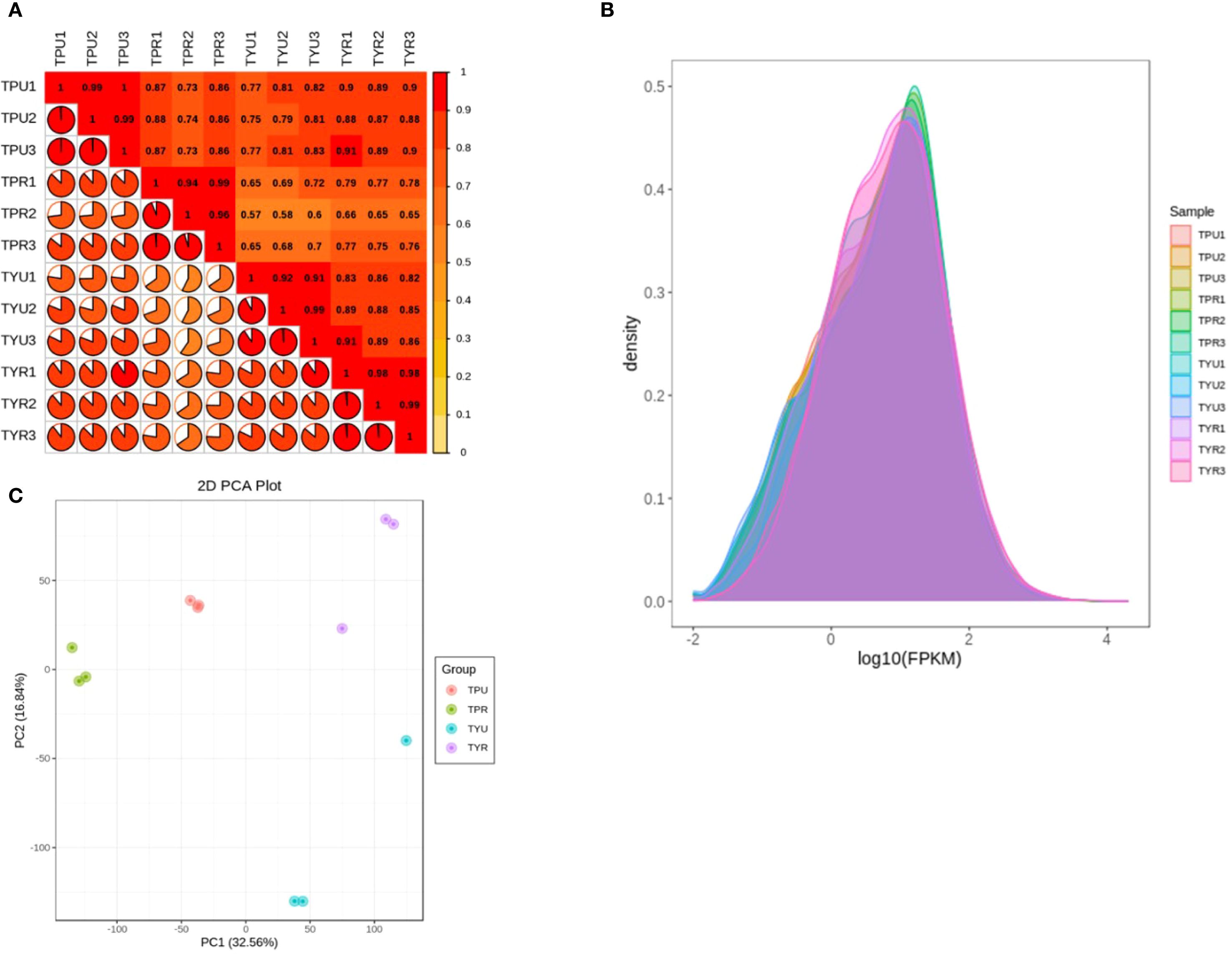 Figure 1. (A) Sample correlation analysis. (B) Comparison of sample gene FPKM density. (C) Principal component analysis of samples.