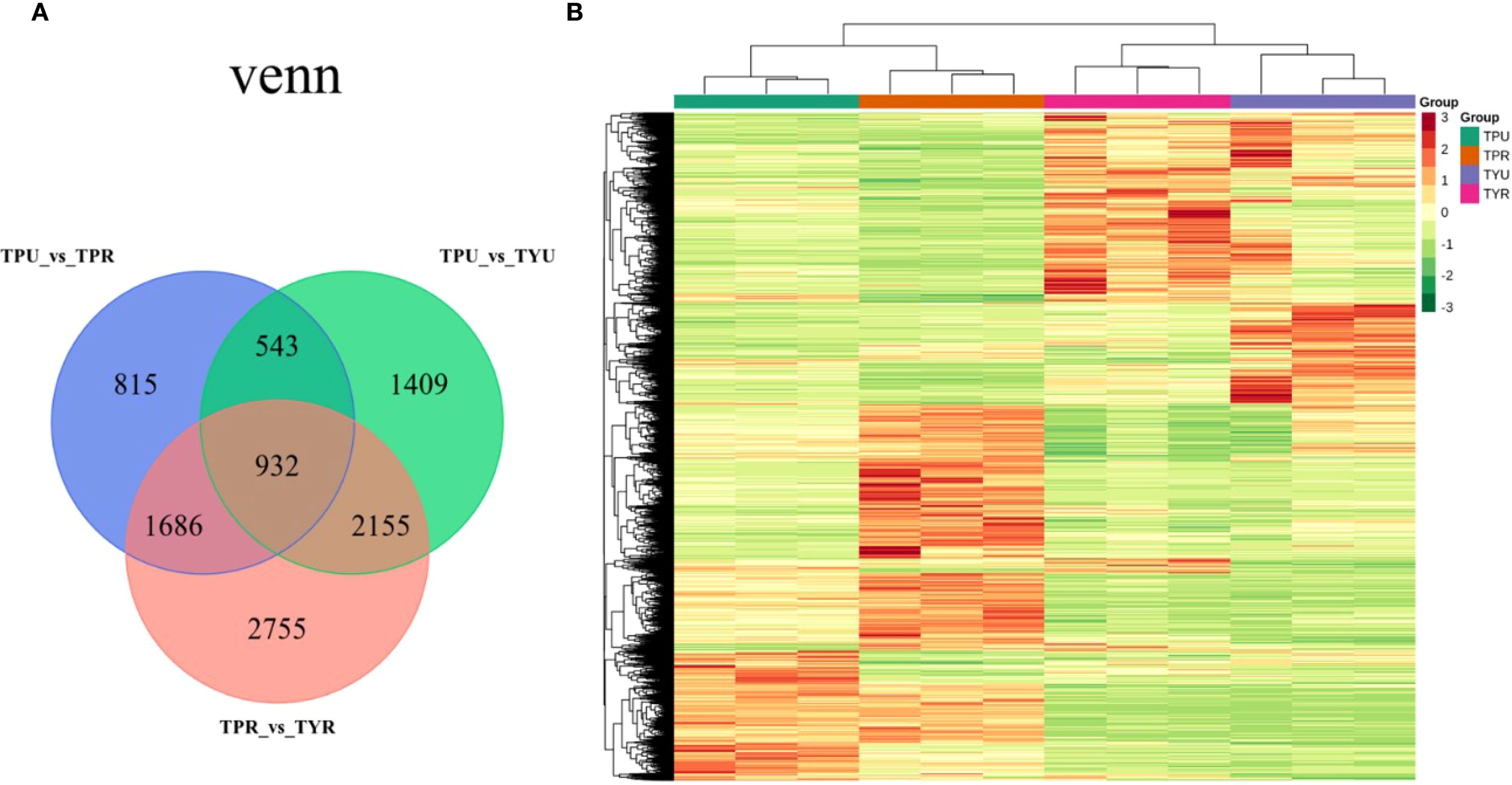 Additionally, KEGG annotation was performed on 5,039 DEGs from the TPU_vs_TYU comparison (Figure 3C), where 1,832 of the DEGs were annotated, representing 36.36% of the total DEGs, and these genes were involved in 89 KEGG metabolic pathways. As with the previous comparisons, the largest number of annotated genes was in the metabolism category, with 884 DEGs associated with metabolic pathways and 536 with the biosynthesis of secondary metabolites.