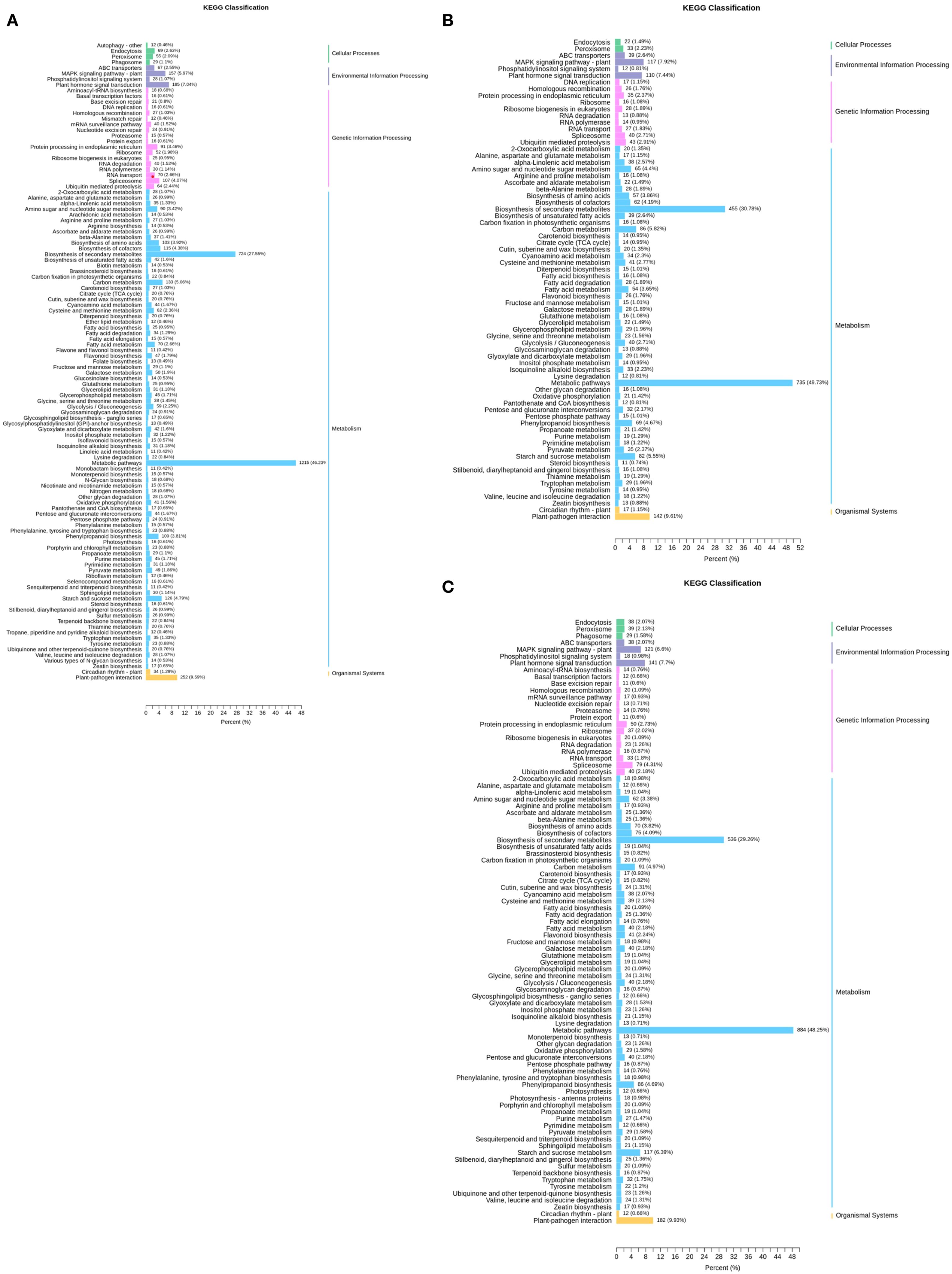 To elucidate the biological functions of DEGs, KEGG pathway enrichment analysis was implemented (Figure 3). In the comparison of TPR_vs_TYR (Figure 3A), 2628 of the 7528 DEGs were successfully annotated, accounting for 34.91% of the total DEGs, and they were involved in 113 metabolic pathways of KEGG. The largest number of annotated genes was found in the category of metabolism, with the metabolic pathway pathways and the biosynthesis of secondary metabolites having the most annotated DEGs, totaling 1215 and 724, respectively.