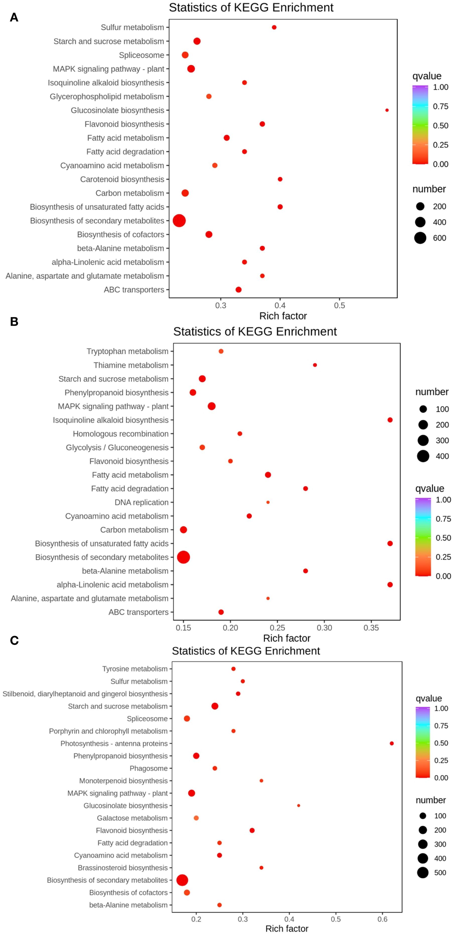 After the genes have been annotated, the number of DEGs in each pathway was calculated, and a KEGG enrichment scatter plot of DEGs was drawn (Figure 4). The KEGG enrichment scatter plot for the DEGs from the TPR_vs_TYR compariso (Figure 4A) display the 20 most significantly enriched pathway entries, with the DEGs annotated to the biosynthetic pathways of secondary metabolites being the most numerous, far exceeding other pathways. Therefore, the Rich factor of this pathway is the smallest and the q-value is the lowest, indicating significant enrichment.