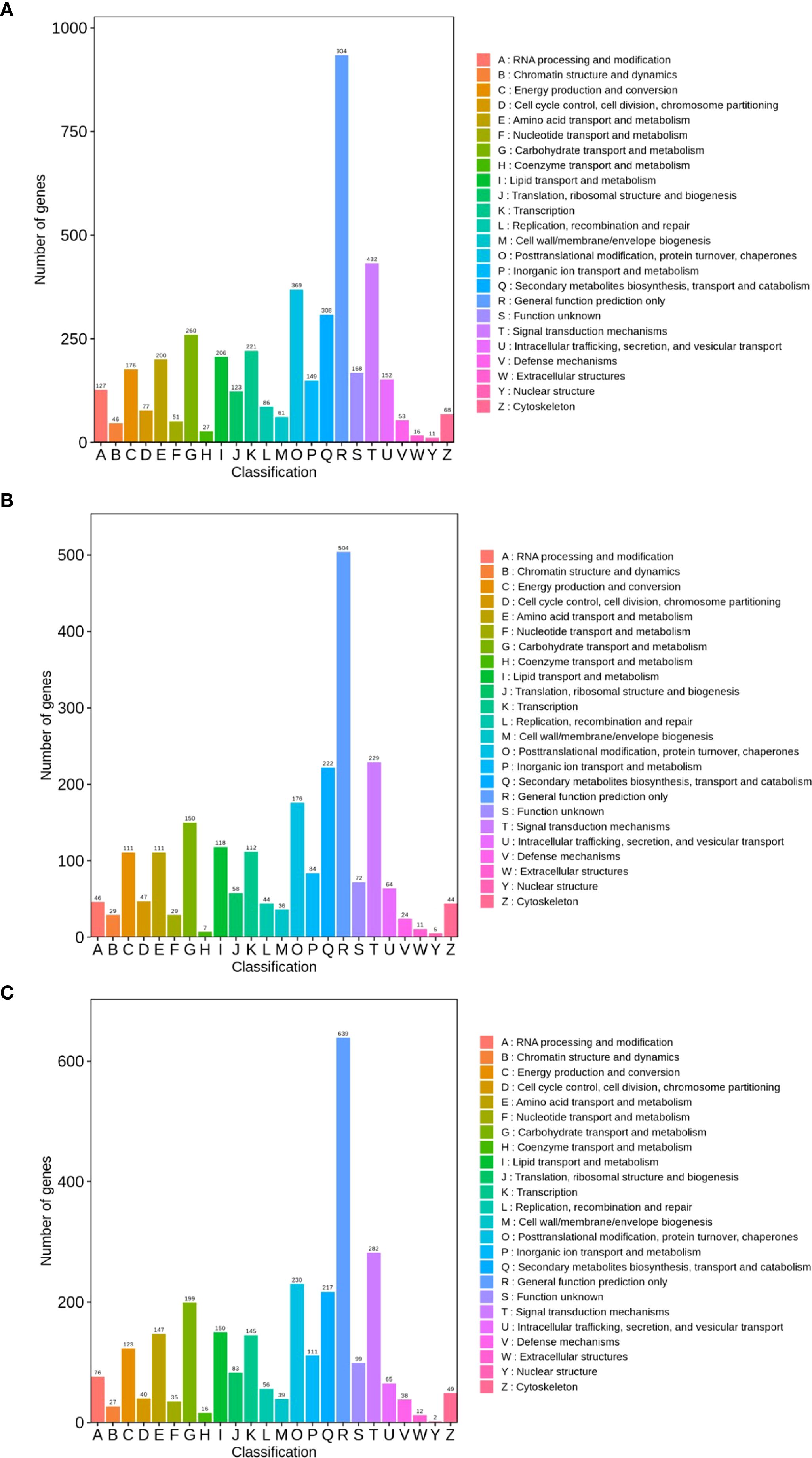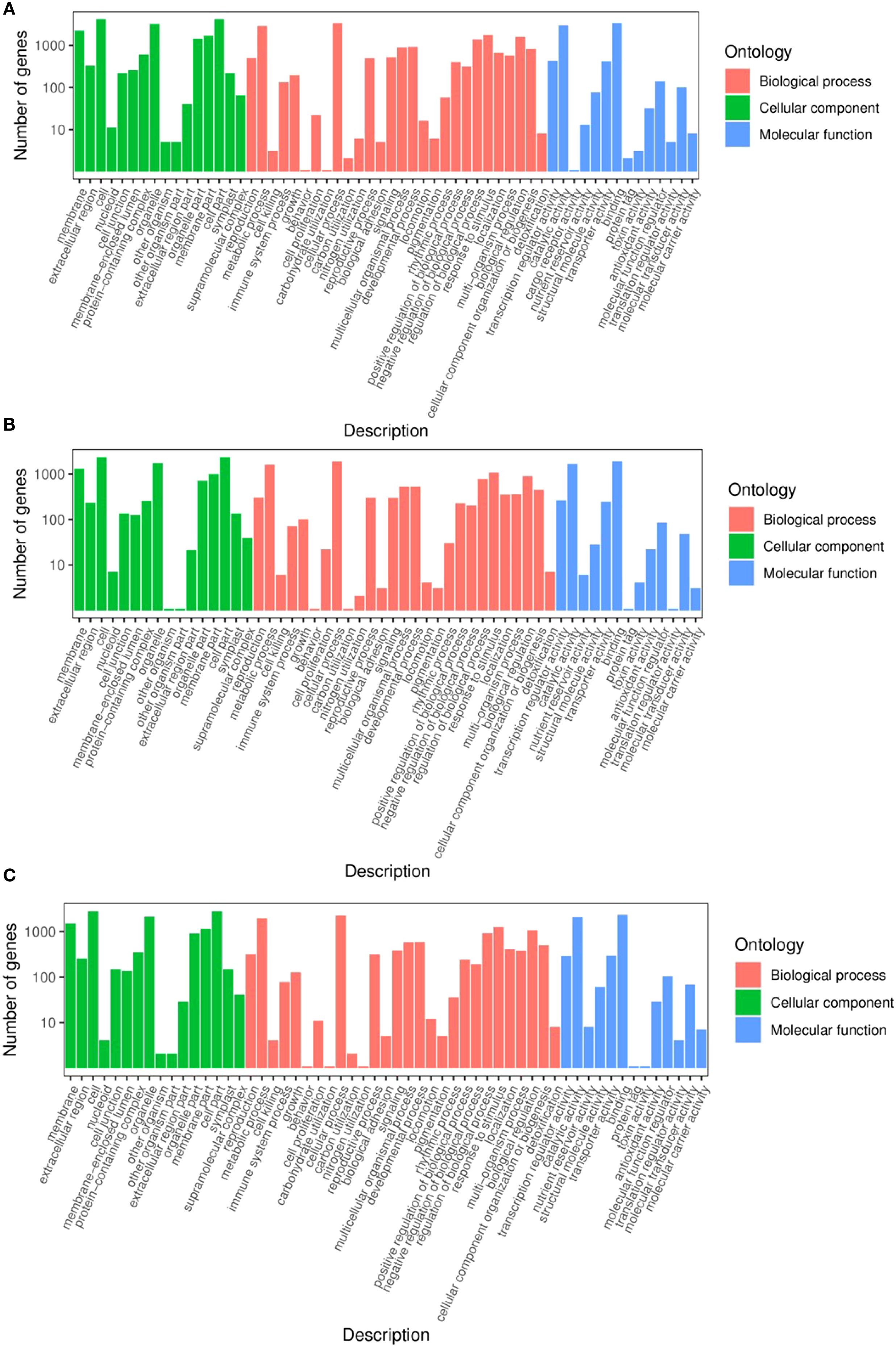Gene Ontology (GO) is an international classification system for gene functions that has been used to describe and categorize gene and protein functions across different species. The categorization of GO is typically divided into three distinct categories (Chen, 2017): The first category, “Molecular Functions” (MFs), encompasses the activities that genes perform within a cell. The second category, “Biological Processes” (BPs), refers to the collective functions that organisms use to survive and reproduce. The third category, “Cellular Components” (CCs), concerns the structural components of cells. The significance of enrichment in GO terms was determined by comparing DEGs with the entire genome background using the hypergeometric test. This approach has been found to identify the GO terms that are significantly enriched (Tatusov et al., 2000).