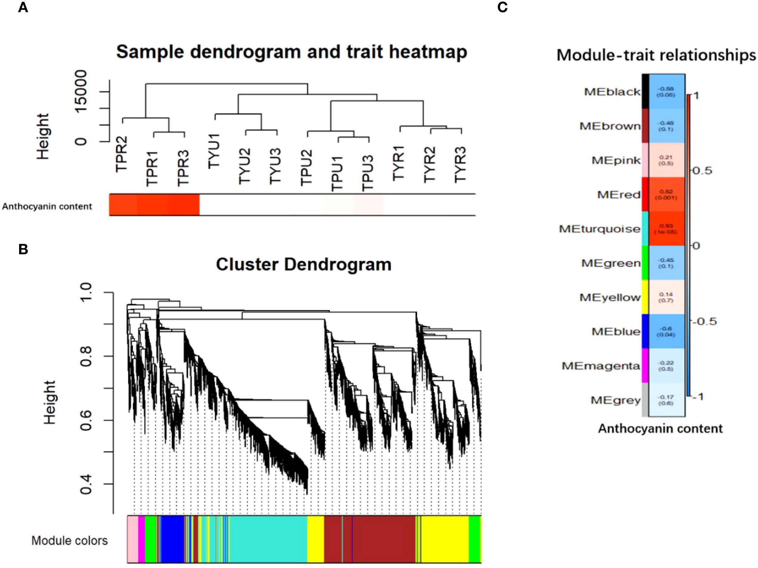 The WGCNA was applied to the DEGs for the purpose of identifying the modules and genes associated with anthocyanin synthesis. Initially, the expression matrix of the DEGs was loaded and examined for any missing values, with details provided by the good sample genes. Subsequently, the samples were clustered, and a soft threshold power β was selected to compute the weight parameters of the neighbor-joining matrix. This step facilitated the construction of the network, the identification of modules, and the plotting of a heatmap illustrating module-trait correlations (Xie et al., 2013).