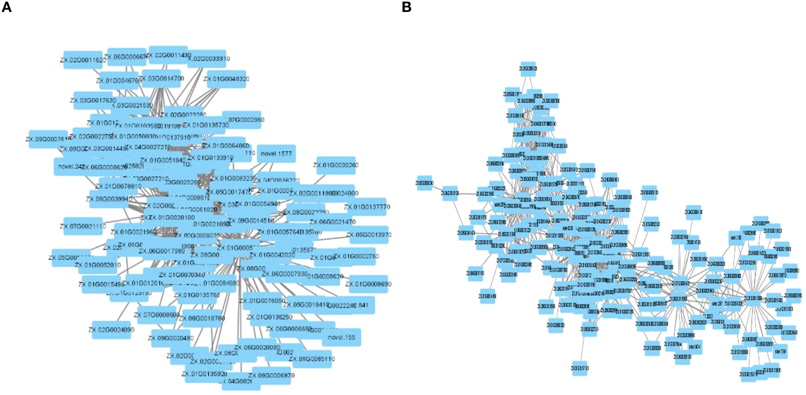 Figure 8. (A) turquoise module co-expresses network diagram. (B) blue module co-expresses network diagram.