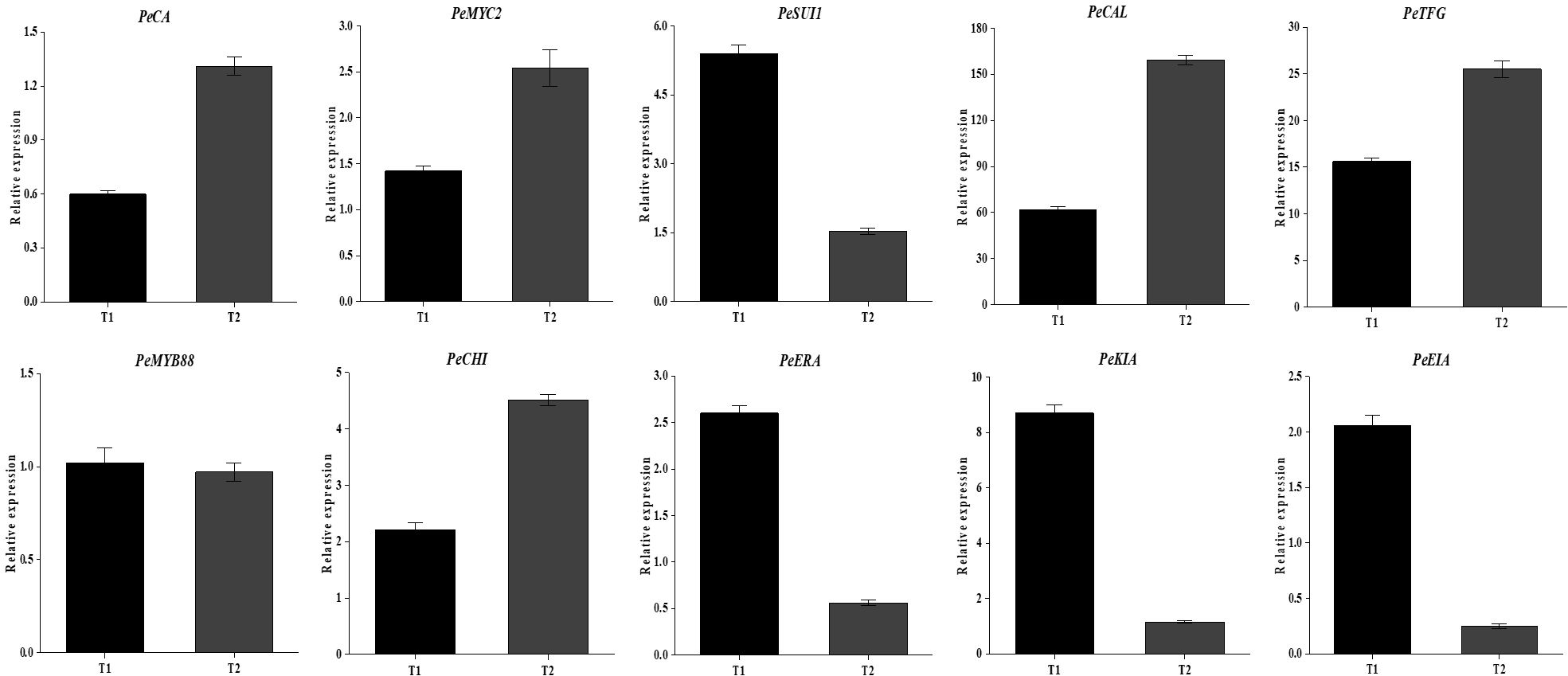 Figure 9. Relative expression levels of key genes. T1 represents the immature stage, while T2 represents the mature stage.
