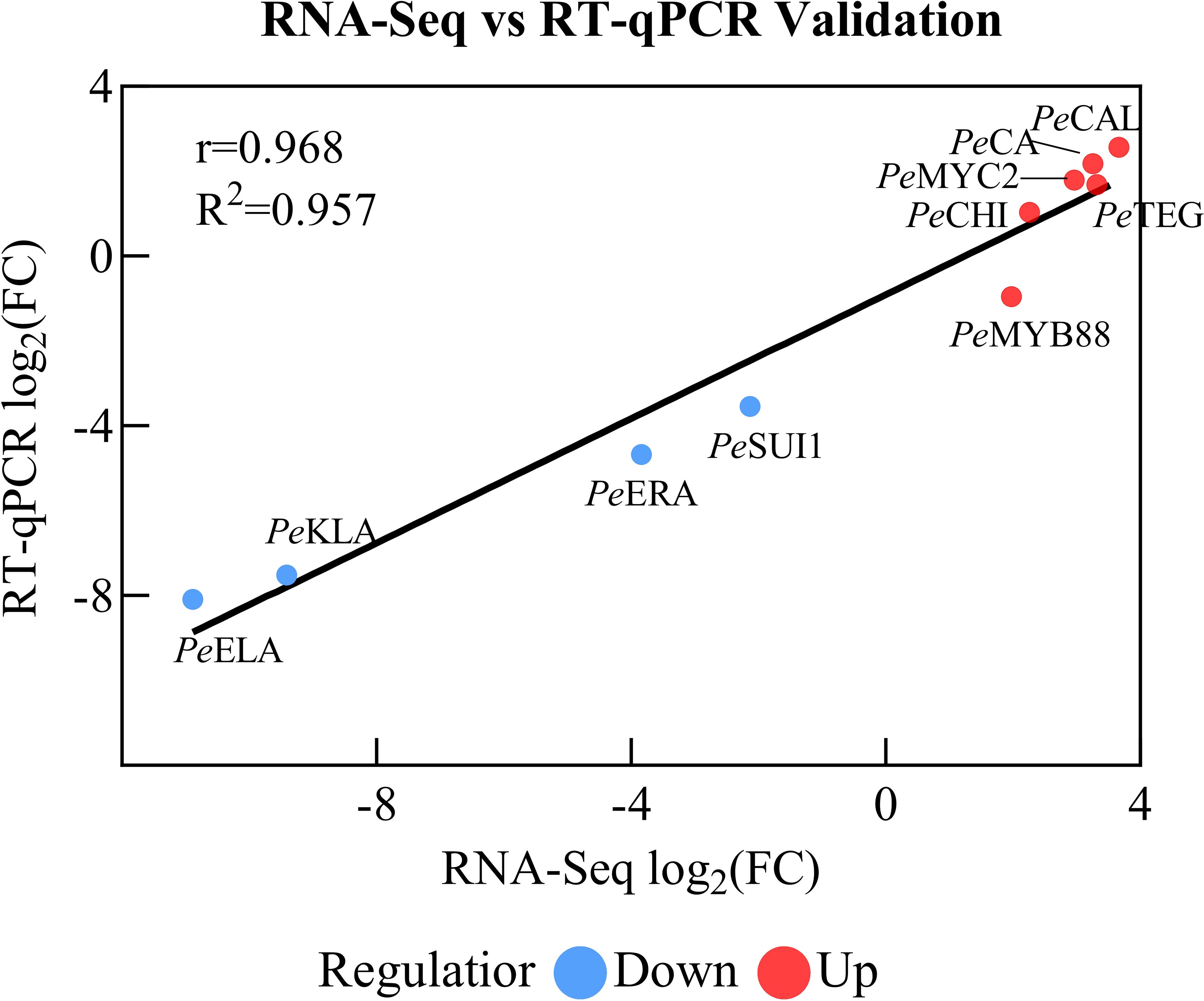 In order to verify the reliability of the transcriptional sequencing data, 10 genes related to anthocyanin content were selected for a real-time fluorescence quantitative PCR verification (Table 2). The β-actin gene was utilized as an internal reference for the test samples by SYBR@Green I chimeric fluorescence method to detect the relative expression levels of each factor at the two maturity levels (Figure 9). The relative expression levels of RT-qPCR were calculated using the 2-ΔΔCT method, while the RNA-seq data were represented by the log2-transformed FPKM values. We conducted a correlation analysis on these two datasets. The results are shown in Figure 10, with a Pearson correlation coefficient (r = 0.968 > 0.9, p < 0.001), indicating that the two methods have extremely strong consistency in detecting gene expression changes. This high consistency confirms the reliability and accuracy of our transcriptome data.
