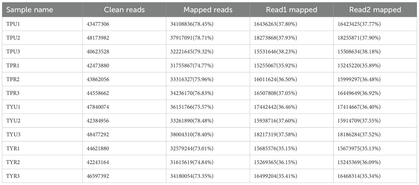 Transcriptome sequencing was conducted in the UW Genetics Ltd. (Shenzhen, China). The total RNA was extracted from the peel samples of the purple passion fruit (TPU and TPR) and yellow passion fruit (TYU and TYR) using an RNA extraction kit (Cheng et al., 2023). Subsequently, Total RNA concentration and purity were measured by spectrophotometry. RNA integrity was assessed using the Agilent 2100 Bioanalyzer. After passing quality control, paired-end sequencing was performed on the Illumina HiSeq platform.