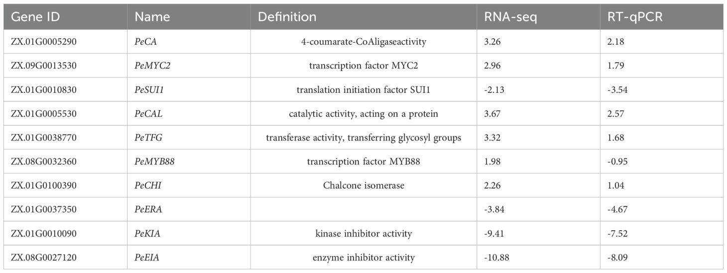 Intriguingly, our analysis also revealed a downregulation of genes encoding enzyme inhibitors (PeKIA and PeEIA) in samples with high anthocyanin content. In the biosynthetic pathway of anthocyanins, the expressions of enzymes such as PAL, CHI and F3H have a significant positive correlation with the synthesis of anthocyanins. This suggests a novel regulatory mechanism in which decreased inhibitor activity may enhance the enzymatic flux through the anthocyanin biosynthetic pathway, For instance, sugars phosphorylated by hexokinase can induce the expression of F3H, thereby increasing the accumulation of anthocyanins. Meanwhile, the specific inhibitors of hexokinase, such as glucosamine and mannose heptose, can block this induction process (Zheng et al., 2009). Although, post-translational regulation through enzyme inhibitors has been less studied in anthocyanin biosynthesis compared to transcriptional control, our findings highlight its potential importance and warrant further investigation.