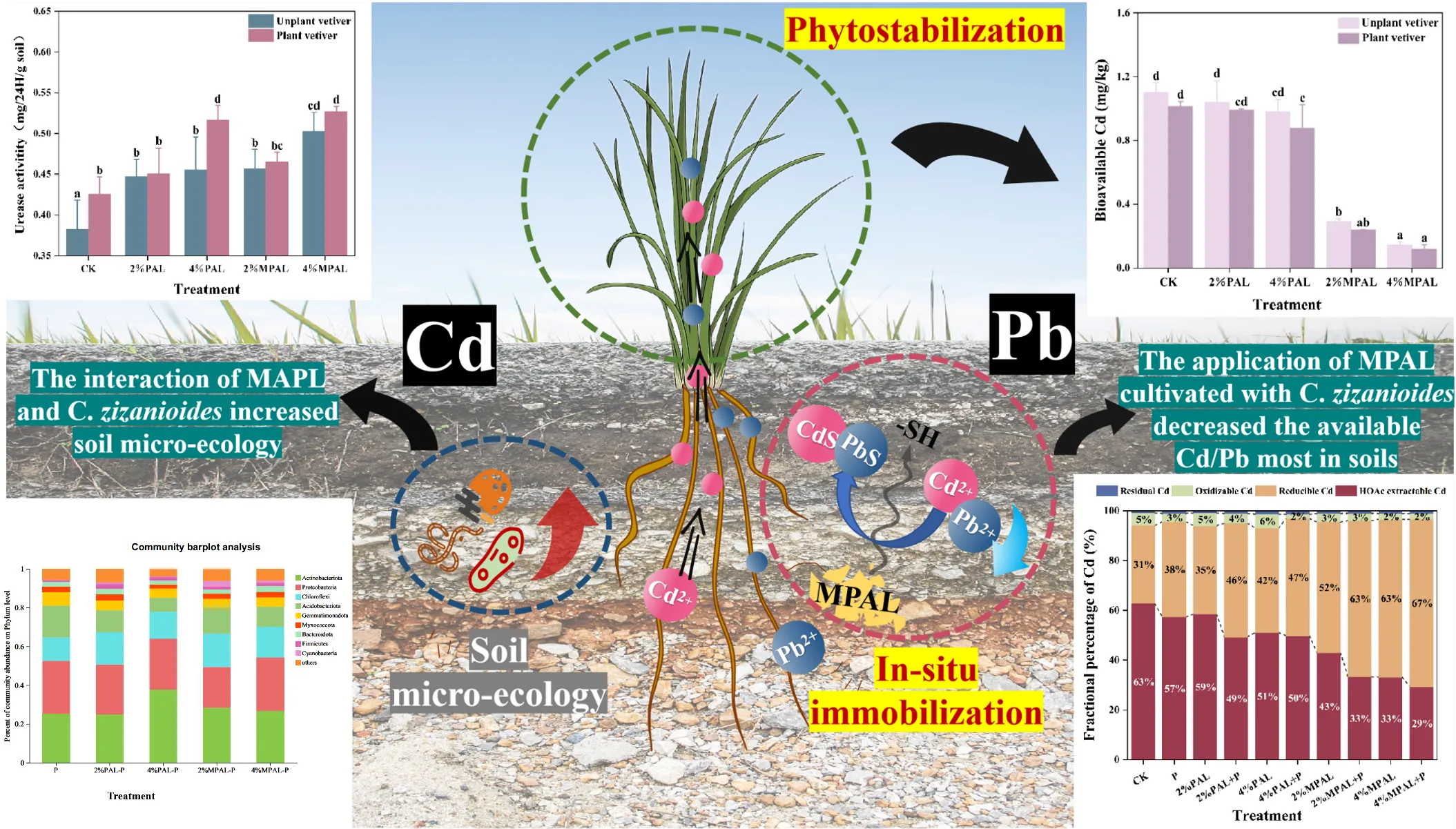 Herein, we hypothesize that MPAL application could provide a novel approach that simultaneously promotes C. zizanioides growth, immobilizes Cd and Pb, and improves rhizospheric microecology, thereby facilitating Cd and Pb phytostabilization in contaminated alkaline soils. The primary objectives of this study were to evaluate the effects of varying MPAL concentrations on Cd and Pb phytostabilization by analyzing plant biomass, antioxidant enzyme activities, Cd and Pb contents in plants, and soil Cd and Pb bioavailability and species distribution. Meanwhile, the effects of MPAL and C. zizanioides on rhizospheric microecology, including soil pH, enzyme activities, and microbial diversity and composition, were also examined.