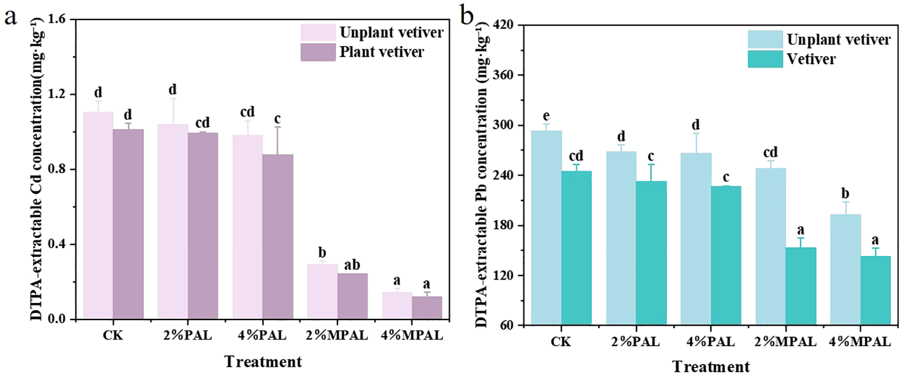 DTPA-extractable (bioavailable) Cd (a) and Pb (b) concentrations in soils under different treatments. Mean with different letters indicated significant difference from each other according to one-way ANOVA and Duncan’s test (p < 0.05).