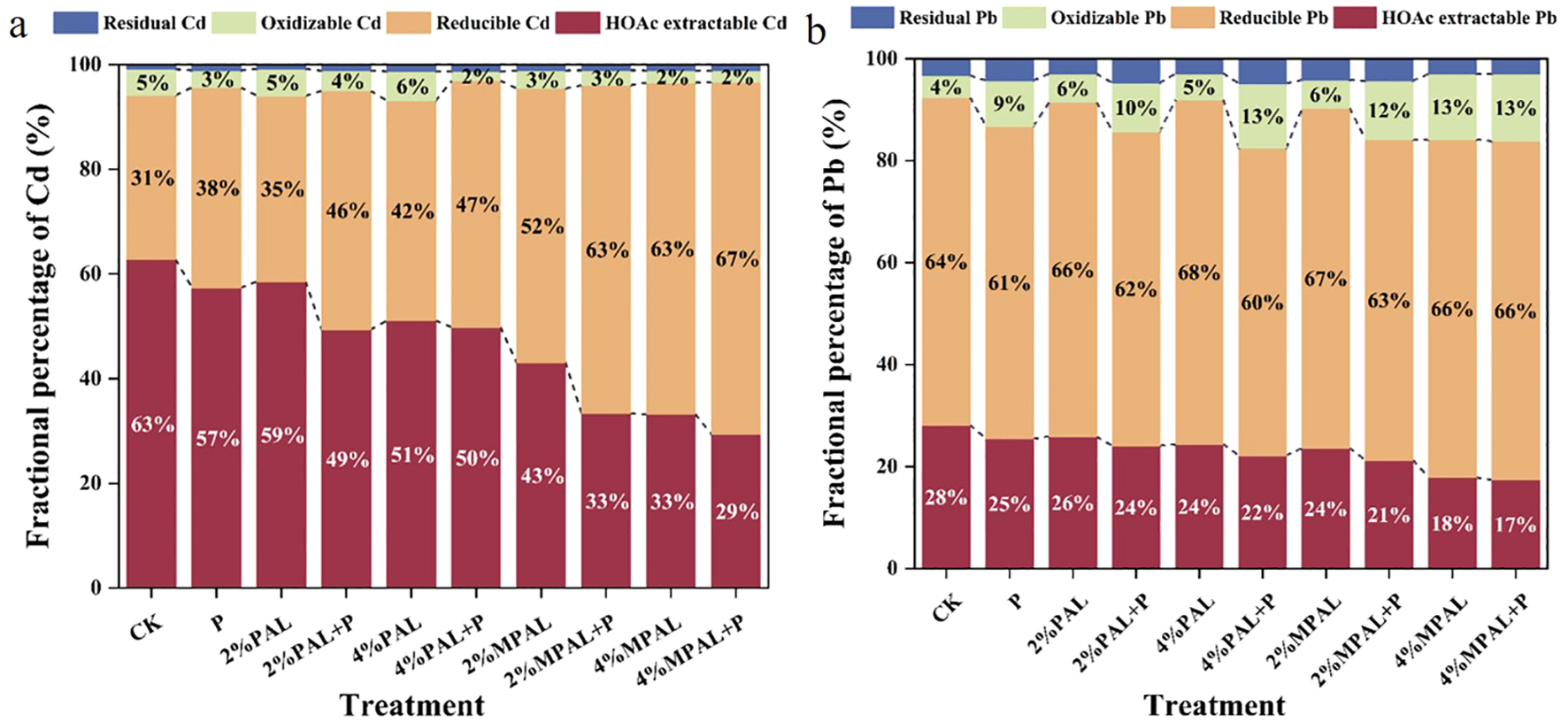 Speciation analysis of Cd (a) and Pb (b) under different treatments.