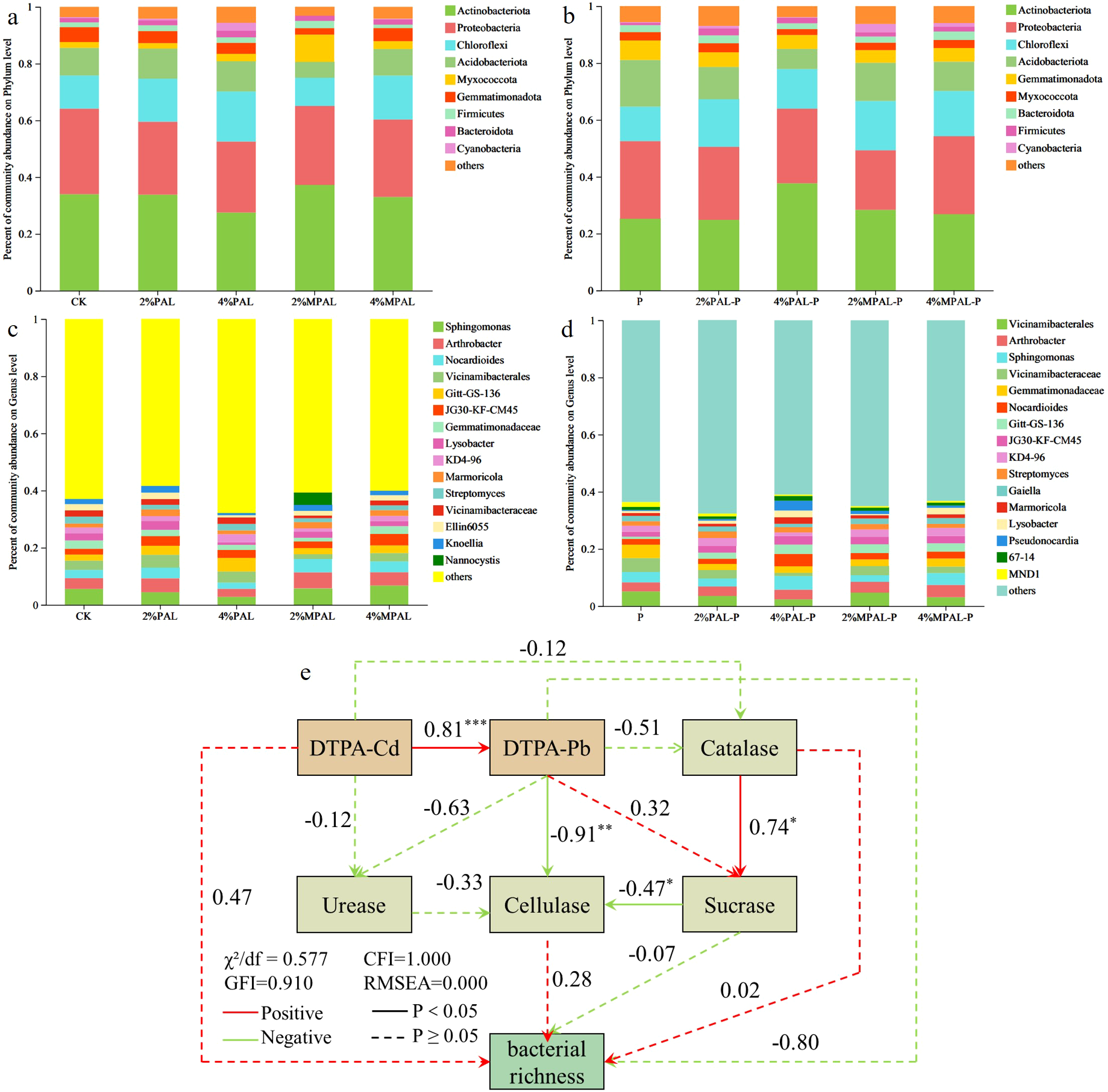 Community abundance on phylum level (a, b) and genus level (c, d) under different treatments. The structural equation model analysis between environmental factors and bacterial richness, numbers next to the arrows indicate standardized path coefficients and asterisks mark their significance: *<0.05; **<0.01; or ***<0.001 (e).