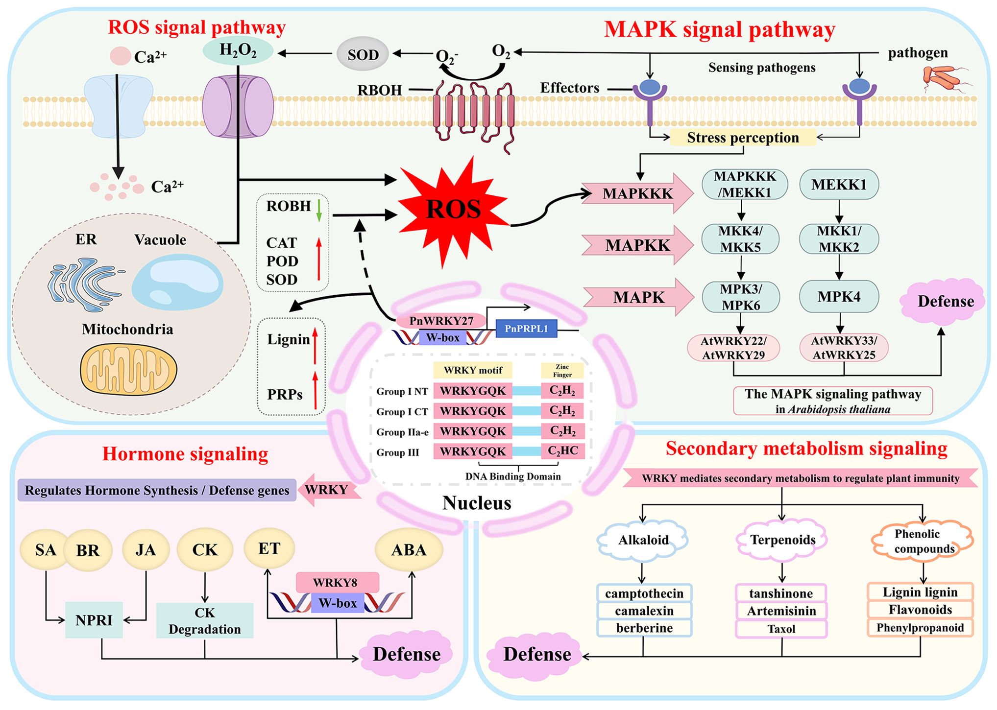 Mechanistically, WRKY TFs upregulate genes involved in lignin biosynthesis, thereby enhancing cell wall-mediated defense. They also modulate antioxidant enzyme systems to alleviate pathogen-induced ROS accumulation and reduce oxidative damage. At the level of signal transduction, WRKY TFs often act synergistically with the MAPK cascade to promote the activation of defense-related genes. In the hormonal signaling network, WRKYs finely regulate immune responses by interacting with key phytohormones, including jasmonic acid (JA), SA, and ethylene (Wang et al., 2024a; Javed and Gao, 2023). For example, PnWRKY9 in Panax notoginseng activates the JA signaling pathway, enhances the expression of the antimicrobial peptide gene PnDEFL1, and increases resistance to Fusarium solani (Zheng et al., 2022). Meanwhile, WRKY TFs have also been shown to directly or indirectly regulate genes involved in the biosynthesis of key secondary metabolites, such as flavonoids, terpenoids, and alkaloids, thereby enhancing metabolic defenses. For instance, EbWRKY30, EbWRKY31, and EbWRKY44 are co-expressed with structural genes involved in flavonoid biosynthesis in Erigeron breviscapus (Vaniot) Hand.-Mazz., leading to enhanced antioxidant capacity and disease resistance (Song et al., 2024d).