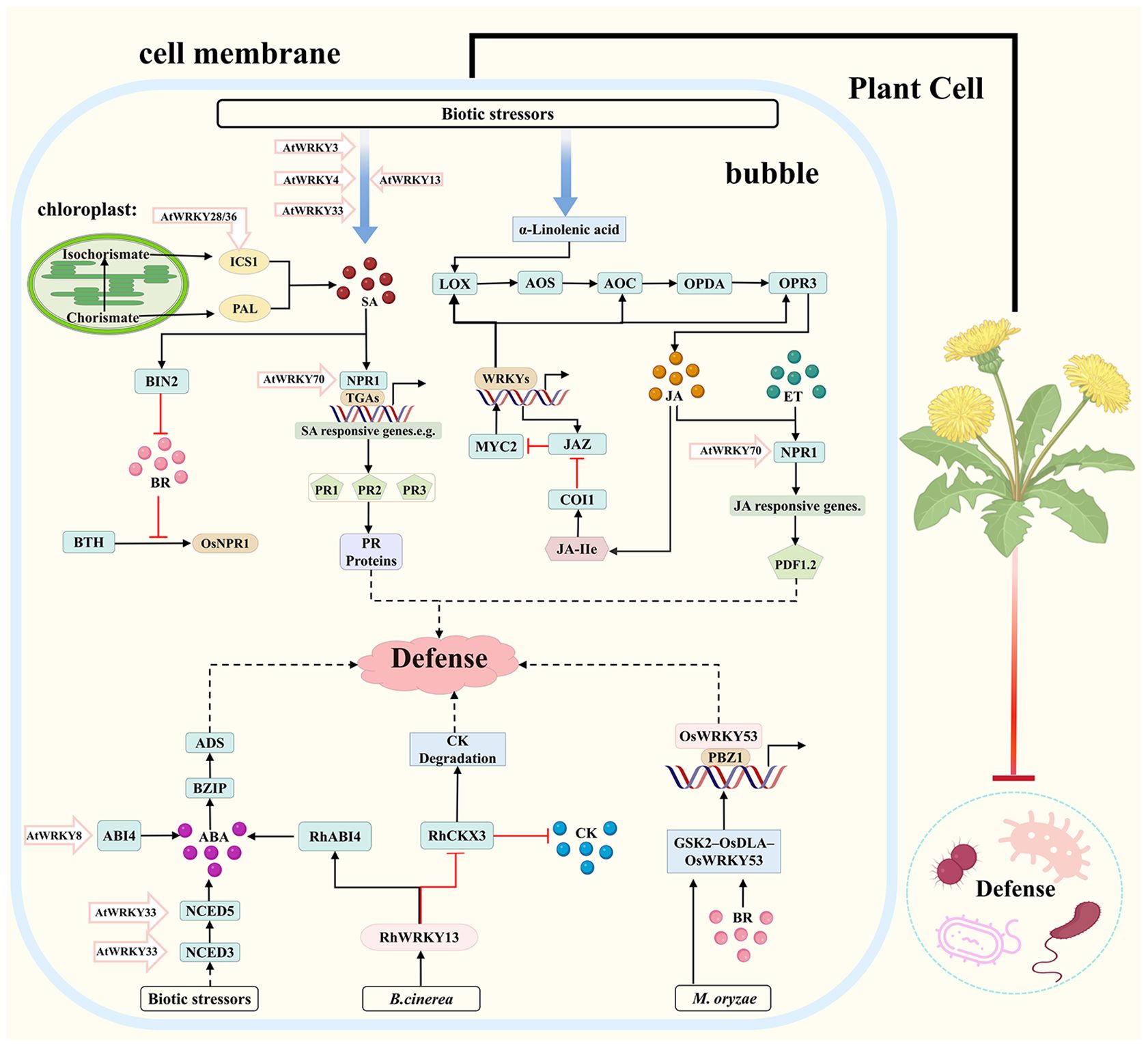 In summary, WRKY TFs, as key regulatory nodes of hormone signaling, not only coordinate synergism and antagonism among immune hormones, but also construct an efficient and dynamic immune network by regulating defense genes and metabolic pathways to help medicinal plants to cope with the complex pathogen environment.