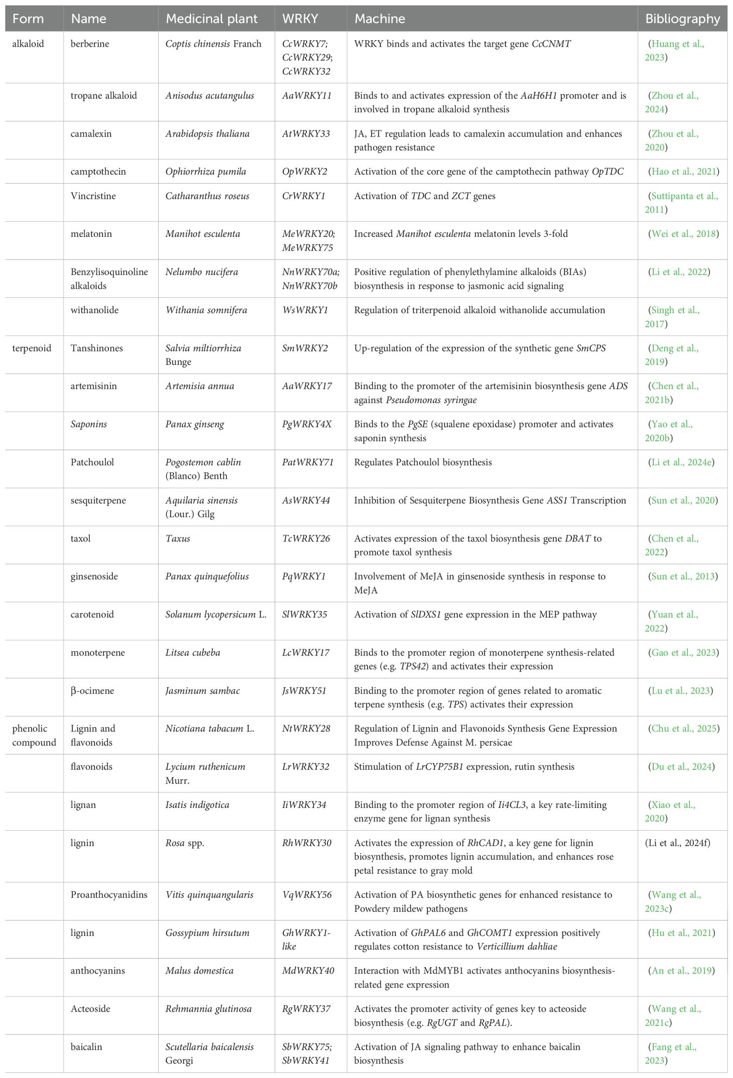 In conclusion, WRKY TFs play a crucial role in enhancing the direct defense of medicinal plants against pathogens by regulating the synthesis of diverse classes of secondary metabolites, thus broadening the understanding of plant immune regulation. To further illustrate these regulatory relationships, we summarize the classification of WRKY-regulated secondary metabolites (Table 2).