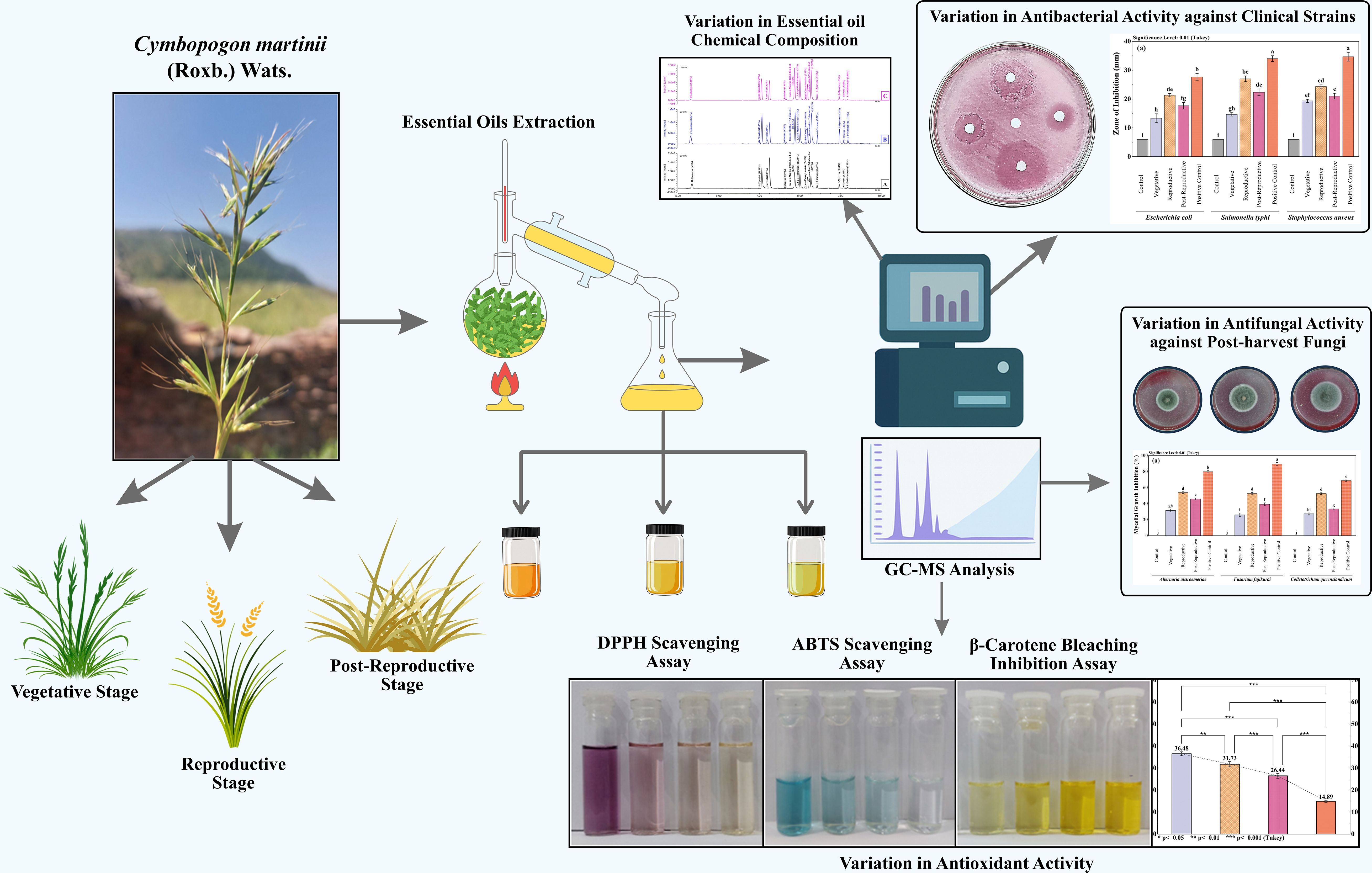 Keywords: Cymbopogon martinii, growth stages, essential oils, post-harvest pathogen, antimicrobial activity, antioxidant activity