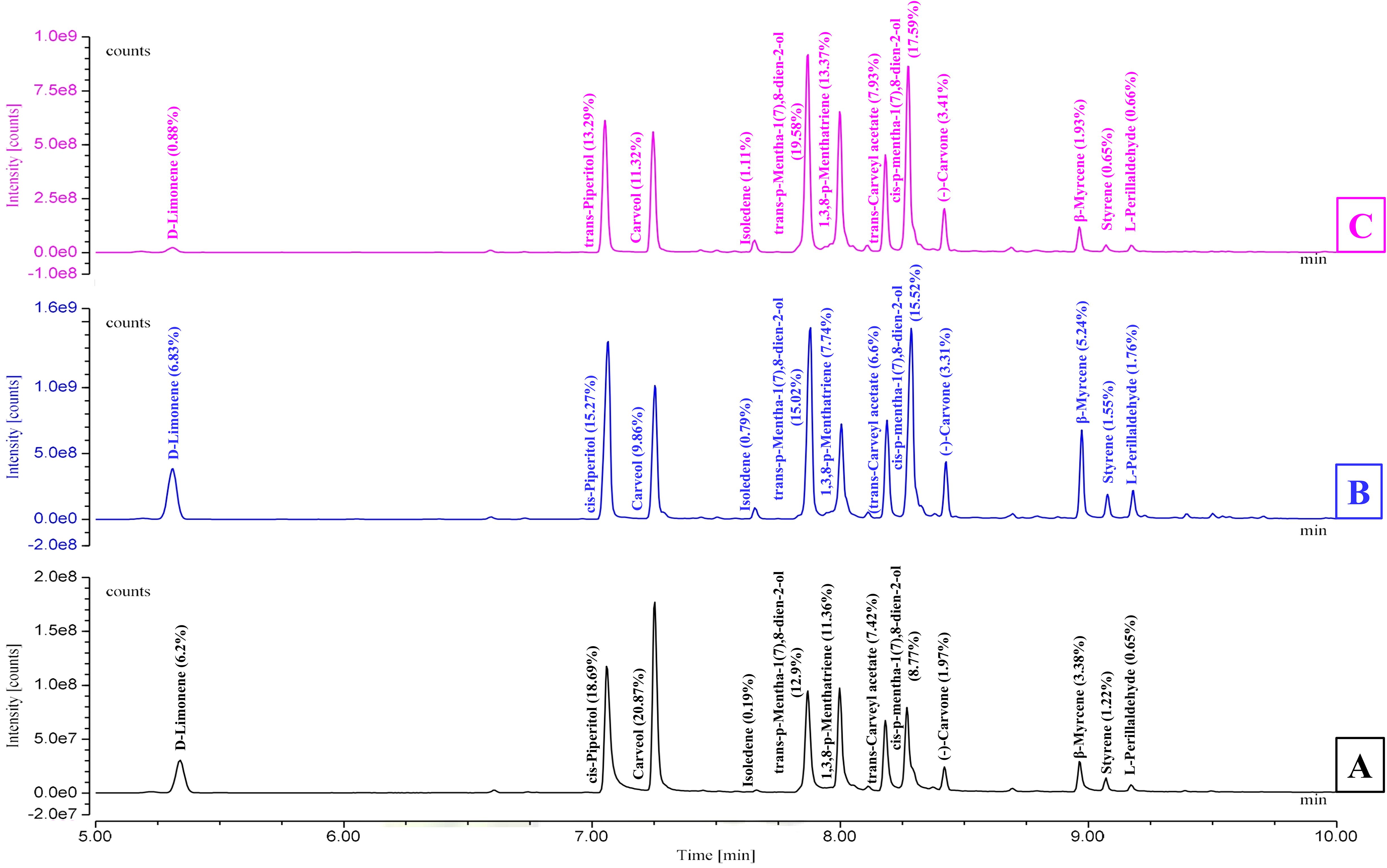 As shown in Table 1 and Figure 1, the essential oils (EOs) isolated from C. martinii at different growth stages, vegetative, reproductive, and post-reproductive, exhibited significant variations in yield, composition, and appearance. CMEOs color transitioned from olive (vegetative) to pale yellow (reproductive) and dark (post-reproductive) as seen in Supplementary Figure S1. Oil yield was highest during the reproductive stage (0.73%), compared to the vegetative (0.35%) and post-reproductive (0.53%) stages. GC-MS analysis identified a total of 59 compounds across all stages. The reproductive phase had the highest number of constituents (49; 97.86%), followed by the post-reproductive (42; 98.70%) and vegetative (30; 99.77%) stages. In the vegetative stage, major compounds included carveol (20.87%), trans-p-mentha-1(7),8-dien-2-ol (12.9%), cis-p-mentha-1(7),8-dien-2-ol (8.77%), trans-carveyl acetate (7.42%), D-limonene (6.2%), and β-myrcene (3.38%). During the reproductive stage, the dominant constituents shifted to cis-piperitol (15.27%), cis-p-mentha-1(7),8-dien-2-ol (15.52%), carveol (9.86%), D-limonene (6.83%), trans-carveyl acetate (6.6%), and carvone (3.31%). In the post-reproductive stage, trans-p-mentha-1(7),8-dien-2-ol (19.58%), cis-p-mentha-1(7),8-dien-2-ol (17.59%), cis-piperitol (13.29%), carveol (11.32%), trans-carveyl acetate (7.93%), and carvone (3.41%) predominated. Across all stages, oxygenated monoterpenes constituted the majority (75–80%), followed by monoterpene hydrocarbons (15–20%), and a minor fraction (1–2%) of non-terpenoid compounds, including aromatic compounds, ethers, esters, alkane derivatives, and chalcones. Stage-specific variation in compound abundance and distribution was effectively visualized using a heat map (Supplementary Figure S2), clearly illustrating the dynamic changes in EO composition during plant development.