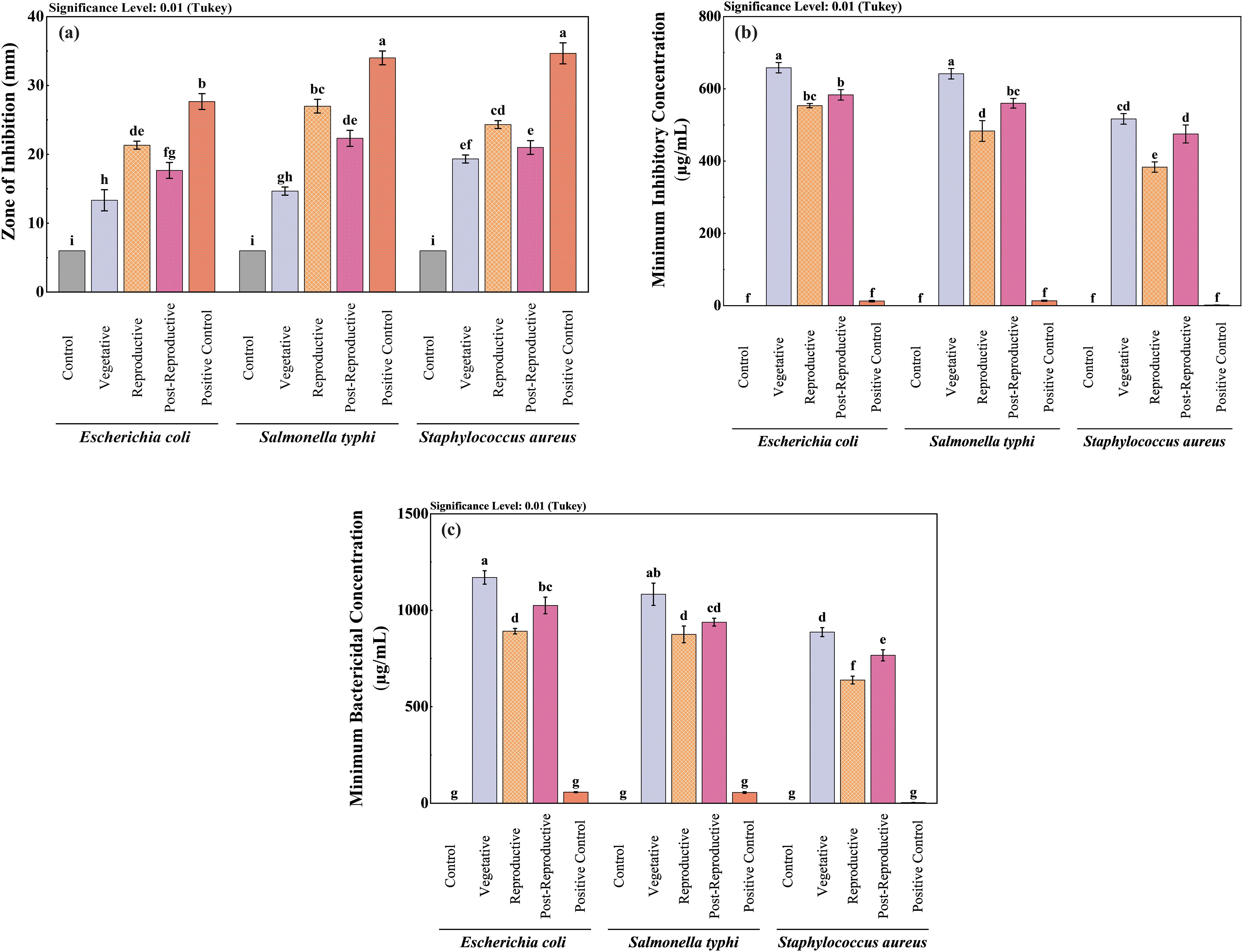 Bar charts showing the effects of different treatments on three bacteria: Escherichia coli, Salmonella typhi, and Staphylococcus aureus. Chart (a) shows the zone of inhibition in millimeters, chart (b) shows the minimum inhibitory concentration in micrograms per milliliter, and chart (c) shows the minimum bactericidal concentration in micrograms per milliliter. Each chart displays results for control, vegetative, reproductive, post-reproductive, and positive control conditions, with significance levels indicated as p ≤ 0.01 using Tukey's method. Error bars reflect standard deviations.