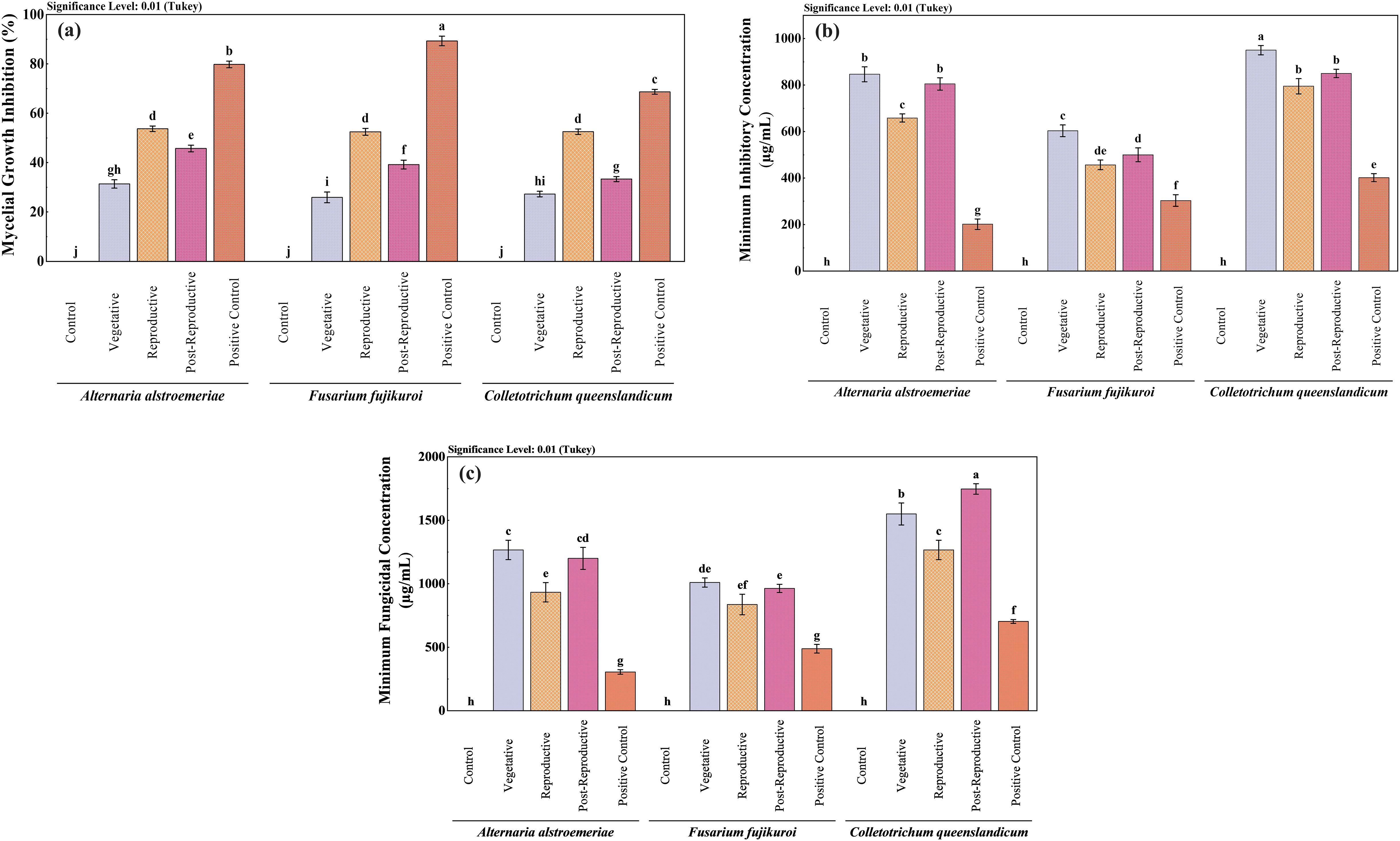 Three bar charts show experimental results on fungal inhibition and concentration. Chart (a) displays mycelial growth inhibition for three fungi: Alternaria alstroemeriae, Fusarium fujikuroi, and Colletotrichum queenslandicum. Chart (b) shows the minimum inhibitory concentration for the same fungi. Chart (c) presents minimum fungicidal concentration. Each chart compares control, vegetative, reproductive, post-reproductive, and positive control treatments, with significant differences labeled. Significance level is 0.01 according to Tukey's test.