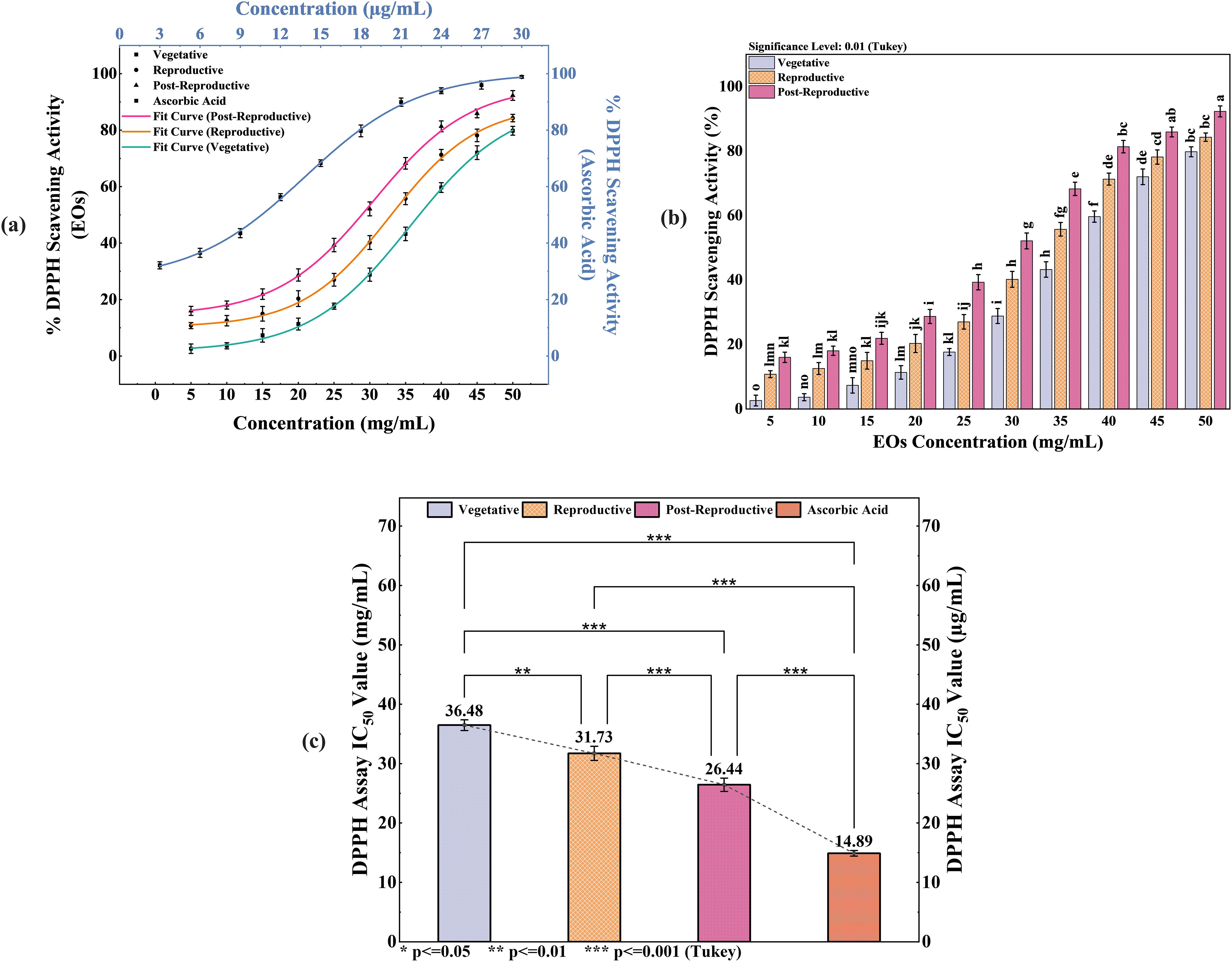 Three graphs display DPPH scavenging activity data. (a) Line graph shows % DPPH activity versus concentration for vegetative, reproductive, and post-reproductive EOs, plus ascorbic acid, with fit curves. (b) Bar graph compares % DPPH activity across concentrations for each group, with statistical significance marked. (c) Bar graph presents DPPH assay IC\(_{50}\) values for groups, showing statistical significance between values.