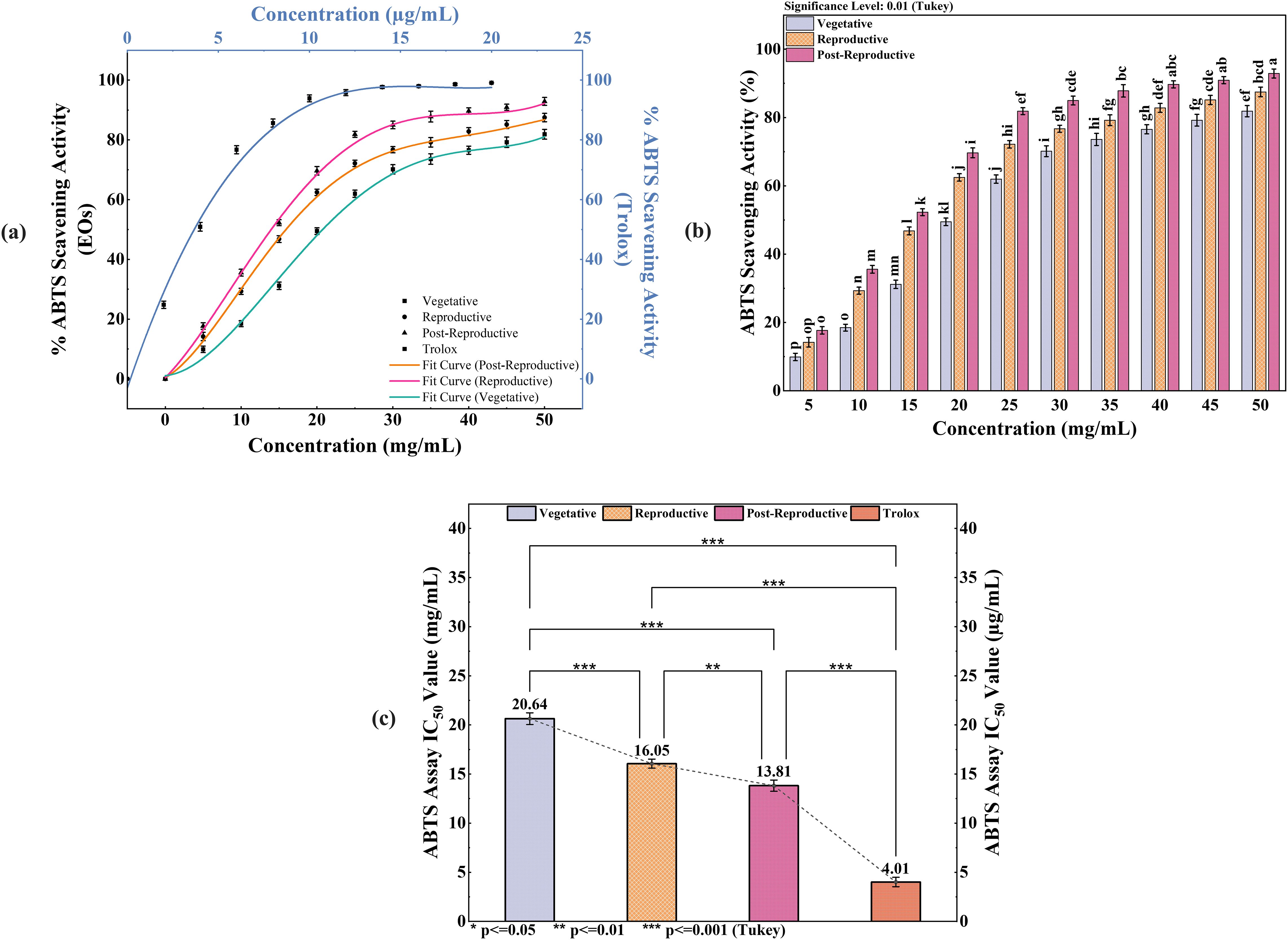 Figure 5. ABTS radical scavenging activity of Cymbopogon martinii essential oils across growth stages. (a) Dose–response curve showing % ABTS radical scavenging by essential oils and Trolox (Positive Control), used for IC50 calculation.(b) Comparative analysis of ABTS activity significance across growth stages (Tukey’s test). (c) IC50 values indicating the concentration required for 50% inhibition, comparing essential oils to Trolox. Bars with identical letters represent no significant difference (p< 0.01). The symbols indicate levels of statistical significance: ** = p < 0.01, *** = p < 0.001.