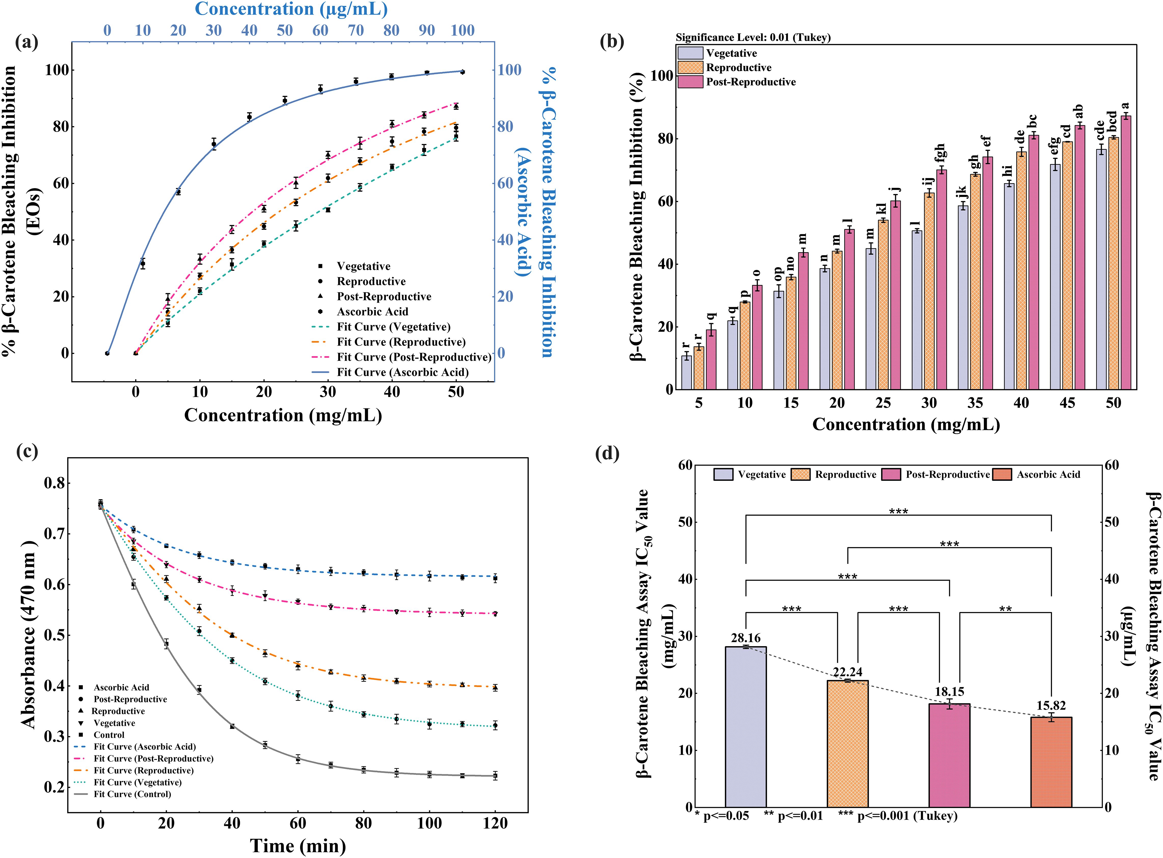 Figure 6. Inhibition of β-carotene degradation by Cymbopogon martinii essential oils at different growth stages. (a) Dose–response curve for % inhibition of β-carotene bleaching by essential oils and ascorbic acid (Positive Control), used for IC50 calculation. (b) Significance test across growth stages (Tukey’s analysis) for bleaching inhibition activity. (c) Rate of β-carotene degradation in the presence of essential oils compared to control. (d) IC50 values of essential oils and standard for bleaching inhibition. Identical letters on bars indicate no significant variation (p< 0.01). The symbols indicate levels of statistical significance: ** = p < 0.01, *** = p < 0.001.