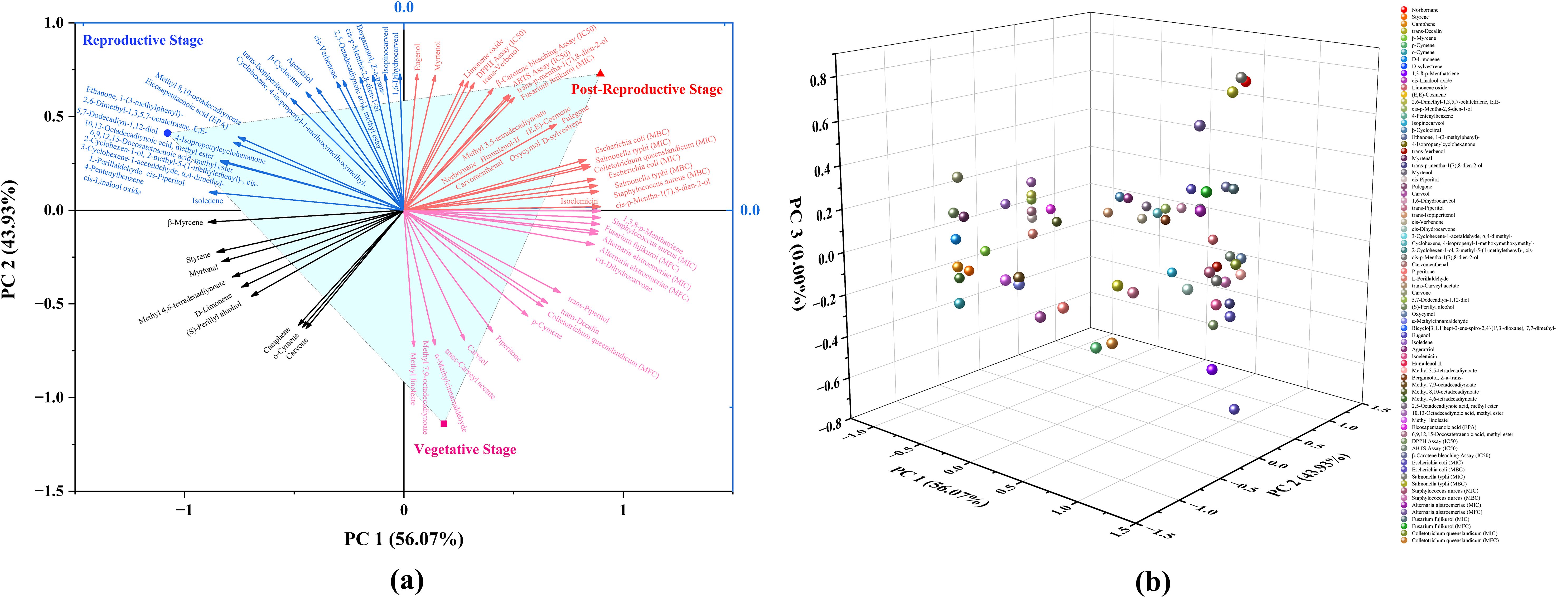 Figure 7. Principal Component Analysis (PCA) depicting the distribution and influence of chemical constituents and biological activities of essential oils from Cymbopogon martinii across three phenological stages. (a) Two-dimensional PCA biplot combining sample scores and variable loadings. Clear separation among vegetative, reproductive, and post-reproductive stages is evident, reflecting significant stage-specific differences in chemical composition and bioactivity. Principal Components 1 and 2 (PC1 and PC2) accounted for 56.07% and 43.93% of the total variance, respectively. (b) PCA loading plot illustrating the spatial distribution and contributions of individual compounds and biological activities to the principal components.