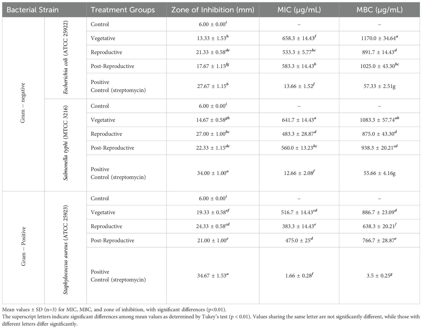 The antibacterial activity of CMEOs from vegetative, reproductive, and post-reproductive stages was evaluated against S. aureus, E. coli, and S. typhi. Significant differences (P < 0.0001) were observed across growth stages and bacterial strains (Supplementary Figure S3), reflecting the variation in CMEOs chemical profiles. Reproductive-stage CMEO exhibited the highest antibacterial efficacy, with the largest ZI and lowest MIC and MBC values (Table 2). Post-reproductive CMEO showed moderate activity, while vegetative-stage CMEO was least effective. For E. coli, ZI was 27.7 mm in the reproductive stage, compared to 17.7 mm and 15.3 mm in post-reproductive and vegetative stages, respectively. S. typhi showed ZIs of 35.7 mm, 24.3 mm, and 19.3 mm across the respective stages. S. aureus followed the same trend: 33.7 mm (reproductive), 22.3 mm (post-reproductive), and 14.7 mm (vegetative) (Figure 2a). MIC and MBC values supported these findings (Figures 2b, c). S. aureus was the most sensitive strain across all stages, with an MIC of 383.3 µg/mL and MBC of 638.3 µg/mL during the reproductive stage. S. typhi and E. coli exhibited higher MICs (483.3 and 533.3 µg/mL) and MBCs (875.0 and 891.7 µg/mL, respectively). This pattern persisted in the other two growth stages, with E. coli consistently showing the lowest susceptibility. Although the positive control exhibited stronger antibacterial effects, CMEOs demonstrated considerable efficacy. Correlation analysis (Supplementary Figure S4) revealed a negative relationship between MIC values and key compounds such as trans-p-mentha-2,8-dien-1-ol, carvone, and D-limonene, suggesting their contribution to antibacterial activity.