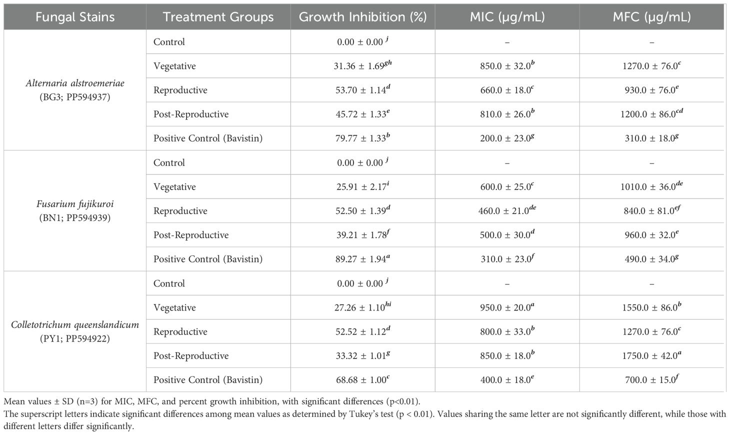 The antifungal activity of CMEOs from vegetative, reproductive, and post-reproductive stages was evaluated against C. queenslandicum, F. fujikuroi, and A. alstroemeriae (Supplementary Figure S5). As shown in Table 3 and Figure 3, variations in CMEO composition significantly influenced fungal growth inhibition, MIC, and MFC (P < 0.0001). Among the tested strains, A. alstroemeriae was the most sensitive. Inhibition increased from 31.36% (vegetative) to 53.70% (reproductive), before declining to 45.72% (post-reproductive). MIC values followed the same trend: 850 µg/mL (vegetative), 660 µg/mL (reproductive), and 810 µg/mL (post-reproductive). Corresponding MFC values were 1270, 930, and 1200 µg/mL, respectively. F. fujikuroi showed moderate sensitivity. The lowest inhibition (25.91%) and highest MIC (600 µg/mL) and MFC (1010 µg/mL) were recorded in the vegetative stage. The reproductive-stage CMEO exhibited the highest efficacy (52.50% inhibition, 500 µg/mL MIC, and 960 µg/mL MFC), while post-reproductive EO showed moderate improvements over the vegetative stage (39.21% inhibition, 500 µg/mL MIC, and 960 µg/mL MFC). C. queenslandicum was the least sensitive. Inhibition was 27.26% in the vegetative stage, peaking at 52.52% in the reproductive stage, then dropping to 33.32% in the post-reproductive stage. MIC and MFC values showed a similar pattern: highest in the vegetative stage (950 and 1270 µg/mL), lowest in the reproductive stage (800 and 1170 µg/mL), and intermediate in the post-reproductive stage (850 and 1250 µg/mL). Although the positive control showed substantially higher antifungal activity (Figure 3), CMEOs demonstrated meaningful inhibitory effects. Correlation analysis (Supplementary Figure S4) indicated strong negative correlations between MFC values and compounds such as (S)-perillyl alcohol, α-methylcinnamaldehyde, and isoeugenol, suggesting their potential contribution to antifungal activity against A. alstroemeriae, F. fujikuroi, and C. queenslandicum.